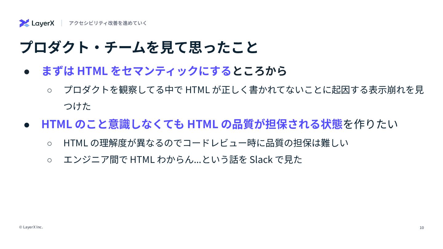 © LayerX Inc. 10 • まずは HTML をセマンティックにするところから ◦ プロダクトを観察してる中で