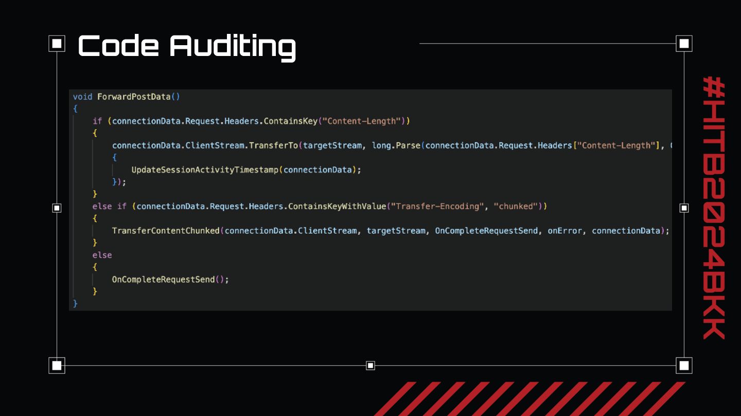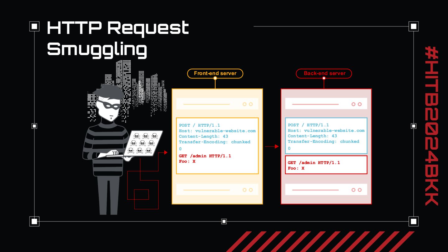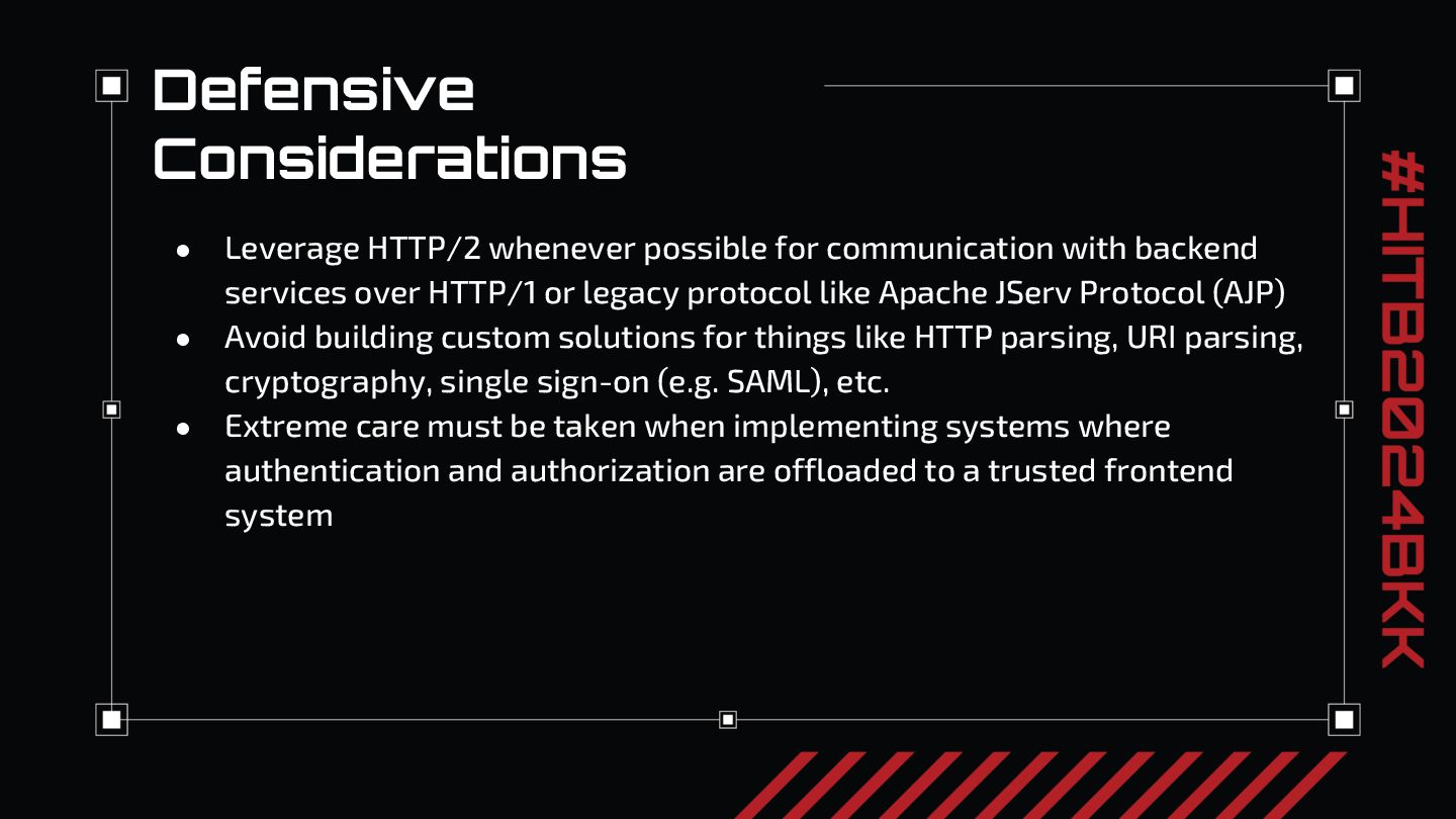 After our review of the three critical risk HRS 0-days we discovered, we will present key takeaways for reviewing application architecture for HRS. In our experience, nearly every security web penetration tester knows where and how to look for SQLi and XSS. But when we first started evaluating applications we had only a limited idea of what HRS was and a vague concept of when to look for it. We want everyone watching to take away the main idea from our talk: just like when you see a login screen you might think to try ‘or 1=1 to exploit SQLi, when you see two different parts of an application processing HTTP requests, each responsible for different parts of the security model, think “http request smuggling”. We will conclude with thoughts on how to approach looking for request smuggling vulnerabilities and recommendations on fixing request smuggling.