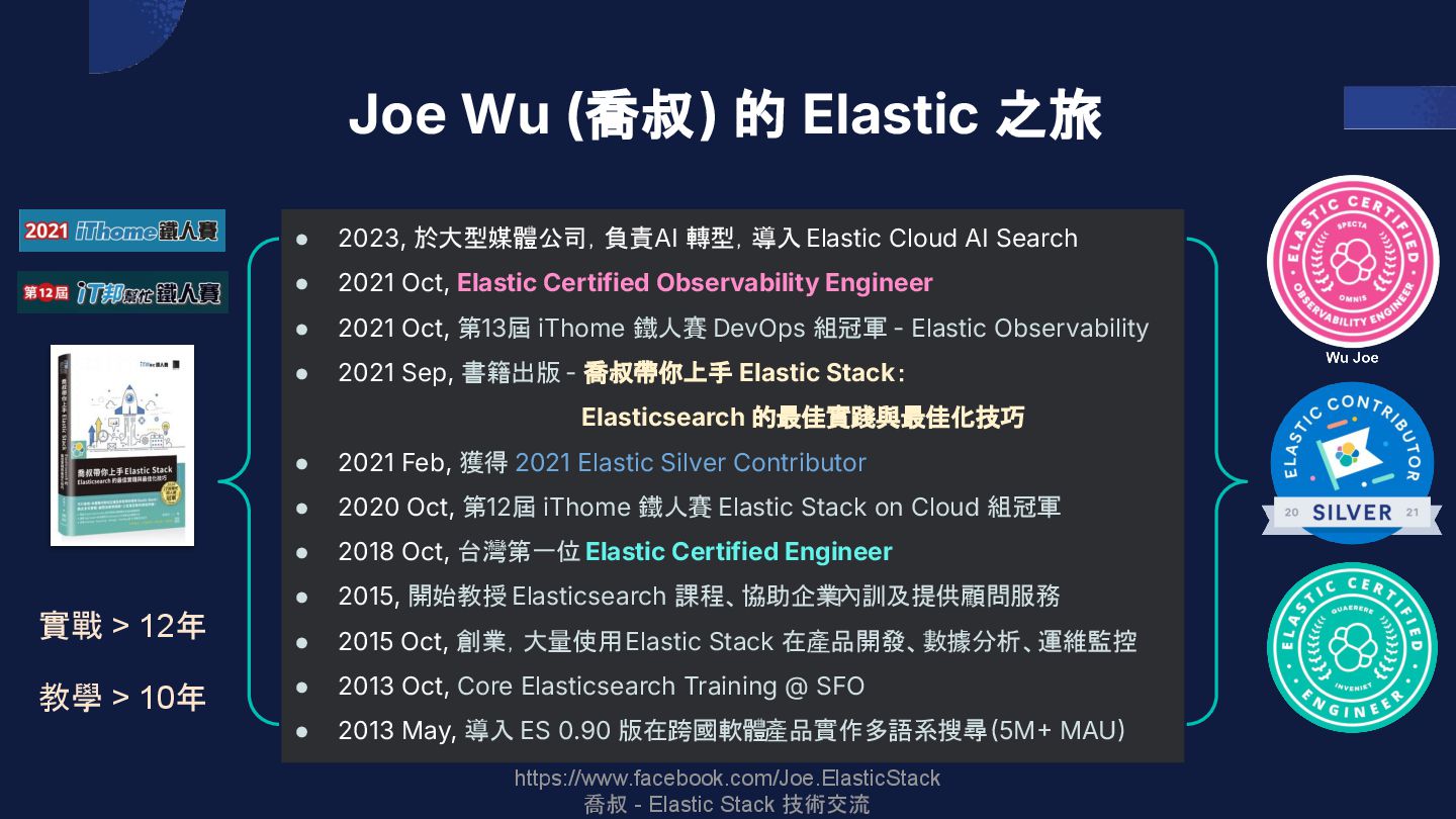 2021 Oct, Elastic Certified Observability Engineer • 2021 Oct, 第13屆 iThome 鐵人賽 DevOps 組冠軍 - Elastic Observability • 2021 Sep, 書籍出版 - 喬叔帶你上手 Elastic Stack: Elasticsearch 的最佳實踐與最佳化技巧 • 2021 Feb, 獲得 2021 Elastic Silver Contributor • 2020 Oct, 第12屆 iThome 鐵人賽 Elastic Stack on Cloud 組冠軍 • 2018 Oct, 台灣第一位 Elastic Certified Engineer • 2015, 開始教授 Elasticsearch 課程、協助企業內訓及提供顧問服務 • 2015 Oct, 創業,大量使用 Elastic Stack 在產品開發、數據分析、運維監控 • 2013 Oct, Core Elasticsearch Training @ SFO • 2013 May, 導入 ES 0.90 版在跨國軟體產品實作多語系搜尋 5M MAU Joe Wu (喬叔) 的 Elastic 之旅 實戰 > 12年 教學 > 10年 https://www.facebook.com/Joe.ElasticStack 喬叔 - Elastic Stack 技術交流