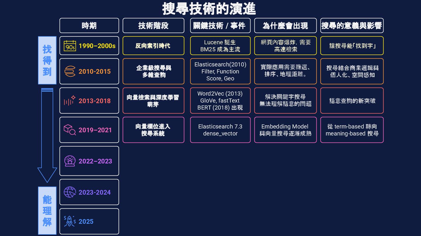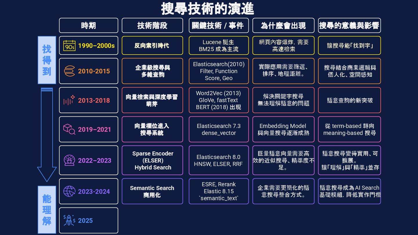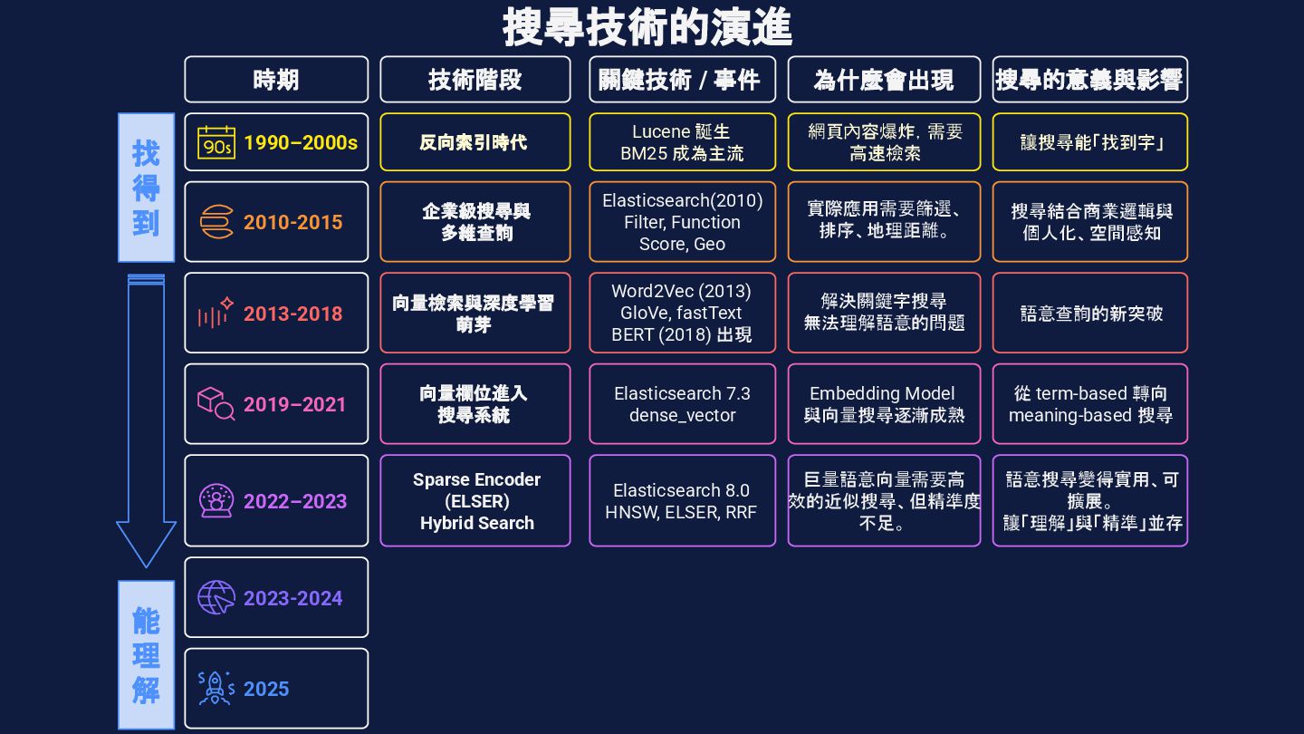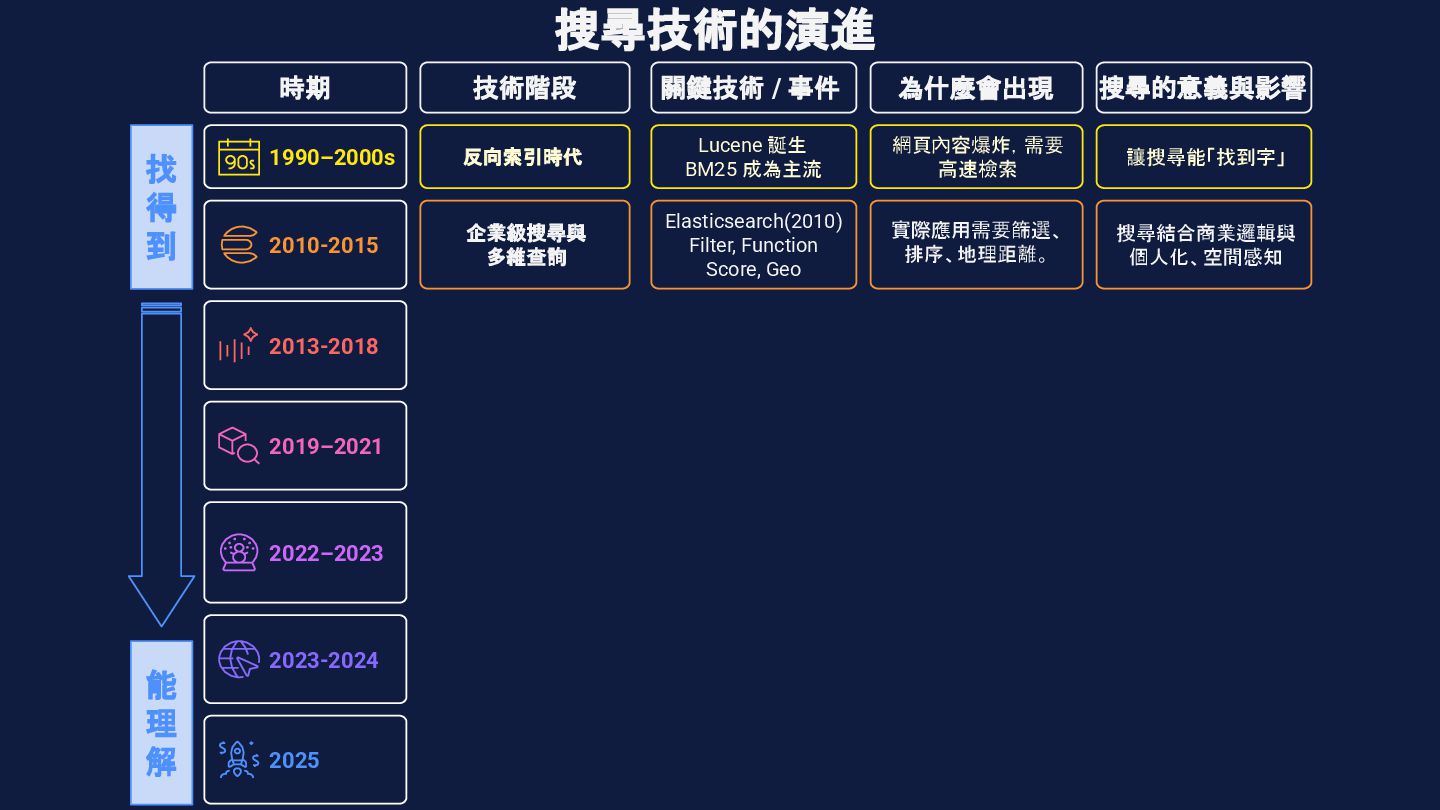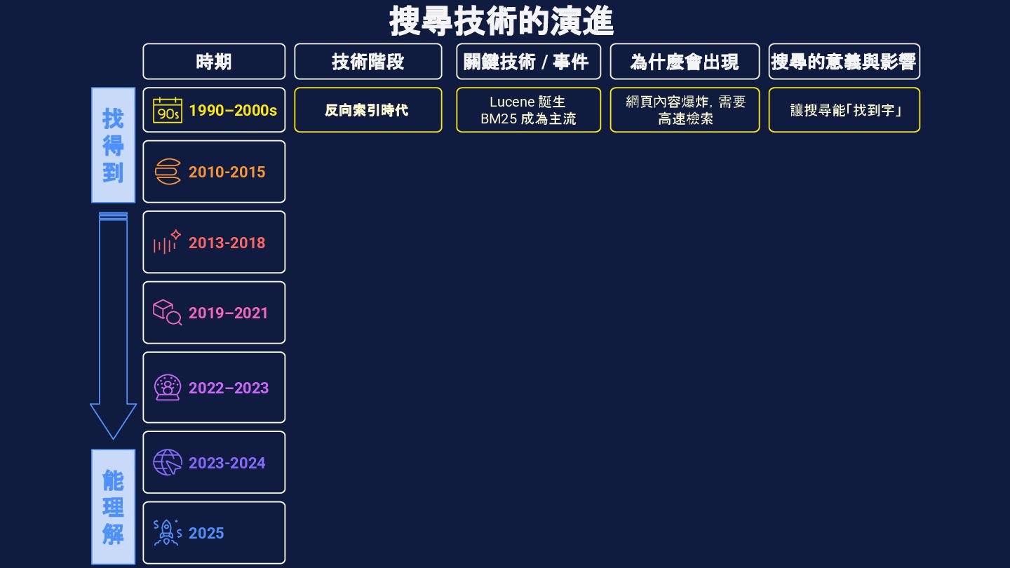 成為主流 反向索引時代 1990–2000s 搜尋的意義與影響 2023-2024 為什麼會出現 關鍵技術 / 事件 技術階段 時期 2025 搜尋技術的演進 找 得 到 能 理 解