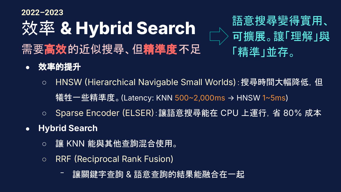 Navigable Small Worlds):搜尋時間大幅降低,但 犧牲一些精準度。Latency: KNN 5002,000ms → HNSW 15ms) ◦ Sparse Encoder ELSER:讓語意搜尋能在 CPU 上運行,省 80% 成本 • Hybrid Search ◦ 讓 KNN 能與其他查詢混合使用。 ◦ RRF Reciprocal Rank Fusion) ᐨ 讓關鍵字查詢 & 語意查詢的結果能融合在一起 語意搜尋變得實用、 可擴展。讓「理解」與 「精準」並存。 2022–2023