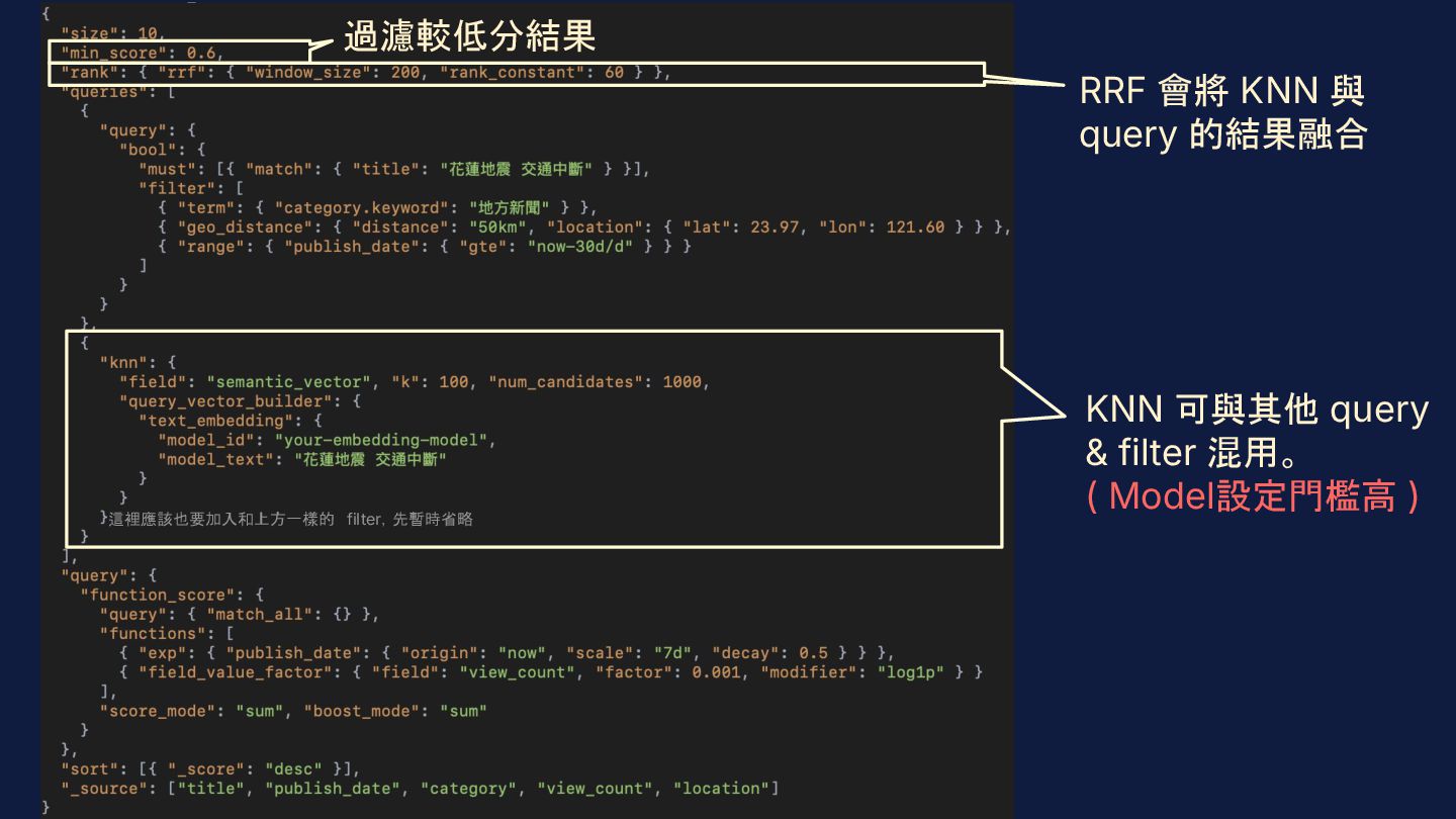會將 KNN 與 query 的結果融合 過濾較低分結果 這裡應該也要加入和上方一樣的 filter,先暫時省略