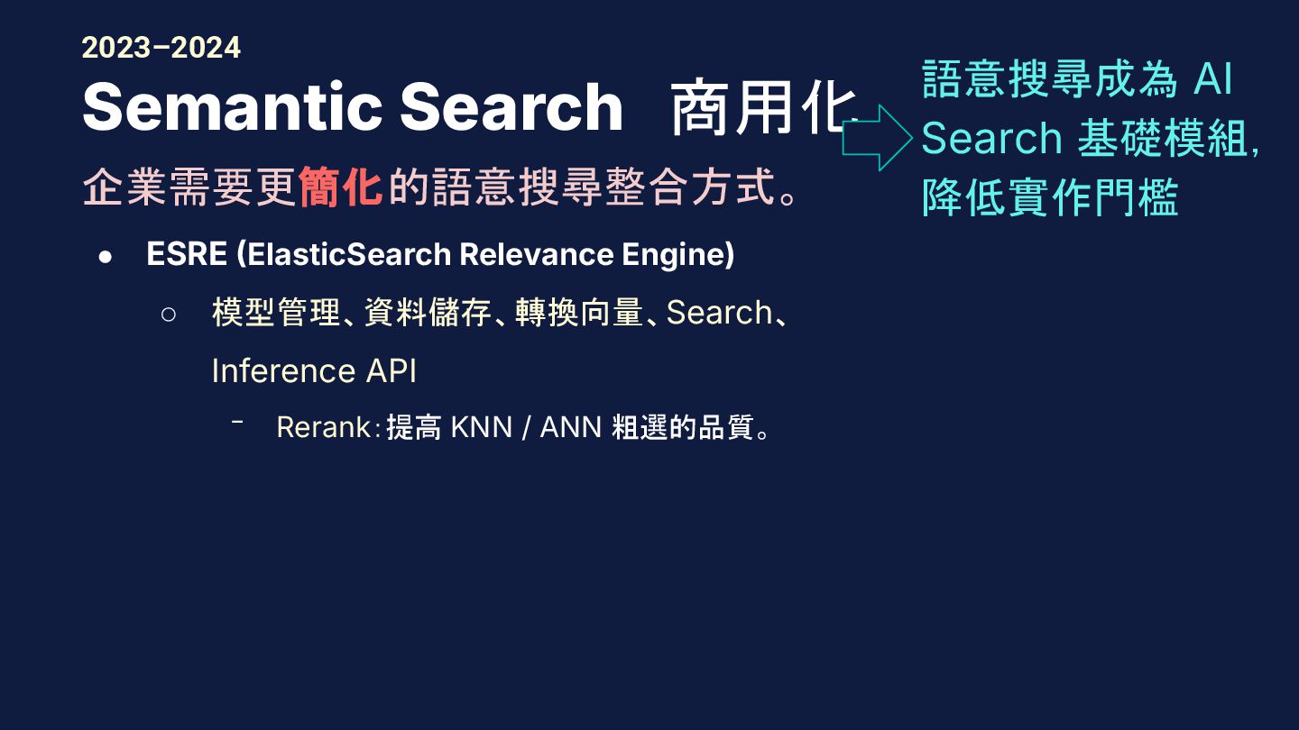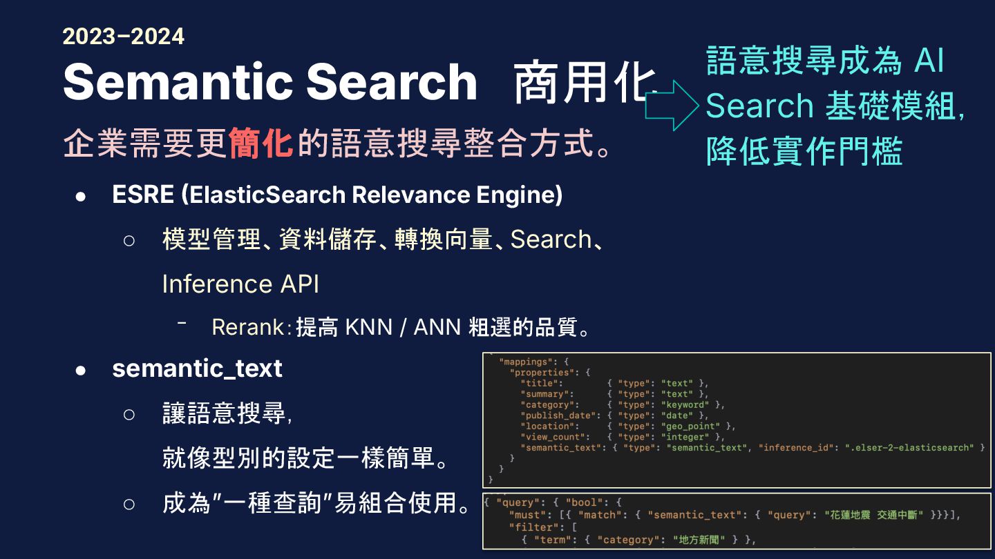 模型管理、資料儲存、轉換向量、Search、 Inference API ᐨ Rerank:提高 KNN / ANN 粗選的品質。 • semantic_text ◦ 讓語意搜尋, 就像型別的設定一樣簡單。 ◦ 成為ˮ一種查詢ˮ易組合使用。 語意搜尋成為 AI Search 基礎模組, 降低實作門檻 2023–2024