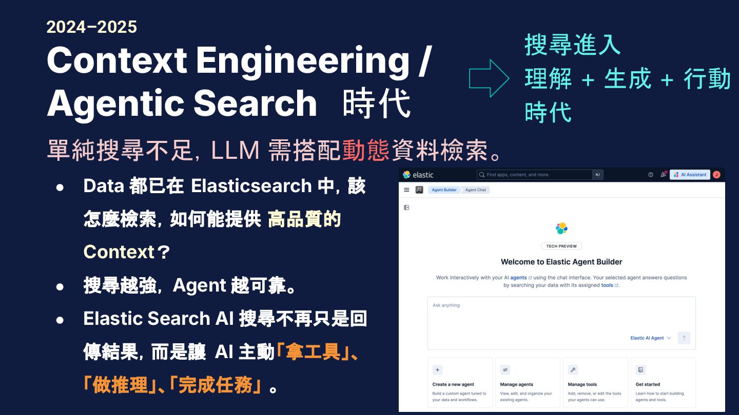 都已在 Elasticsearch 中,該 怎麼檢索,如何能提供 高品質的 Context? • 搜尋越強, Agent 越可靠。 • Elastic Search AI 搜尋不再只是回 傳結果,而是讓 AI 主動「拿工具」、 「做推理」、「完成任務」 。 搜尋進入 理解 + 生成 + 行動 時代 2024–2025