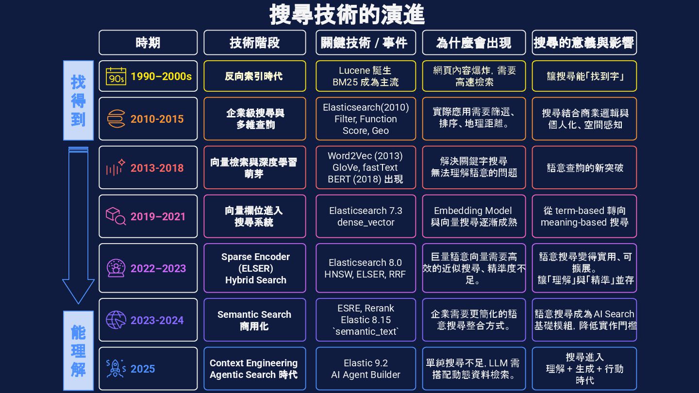無法理解語意的問題 語意查詢的新突破 2013-2018 搜尋結合商業邏輯與 個人化、空間感知 實際應用需要篩選、 排序、地理距離。 Elasticsearch(2010) Filter, Function Score, Geo 2019–2021 向量欄位進入 搜尋系統 Elasticsearch 7.3 dense_vector Embedding Model 與向量搜尋逐漸成熟 從 term-based 轉向 meaning-based 搜尋 企業級搜尋與 多維查詢 2010-2015 讓搜尋能「找到字」 網頁內容爆炸,需要 高速檢索 2022–2023 Sparse Encoder (ELSER) Hybrid Search Elasticsearch 8.0 HNSW, ELSER, RRF 巨量語意向量需要高 效的近似搜尋、精準度不 足。 語意搜尋變得實用、可 擴展。 讓「理解」與「精準」並存 Lucene 誕生 BM25 成為主流 反向索引時代 1990–2000s 搜尋的意義與影響 2023-2024 Semantic Search 商用化 ESRE, Rerank Elastic 8.15 `semantic_text` 企業需要更簡化的語 意搜尋整合方式。 語意搜尋成為 AI Search 基礎模組,降低實作門檻 為什麼會出現 關鍵技術 / 事件 技術階段 時期 2025 Context Engineering Agentic Search 時代 Elastic 9.2 AI Agent Builder 搜尋進入 理解 + 生成 + 行動 時代 單純搜尋不足,LLM 需 搭配動態資料檢索。 找 得 到 能 理 解 搜尋技術的演進
