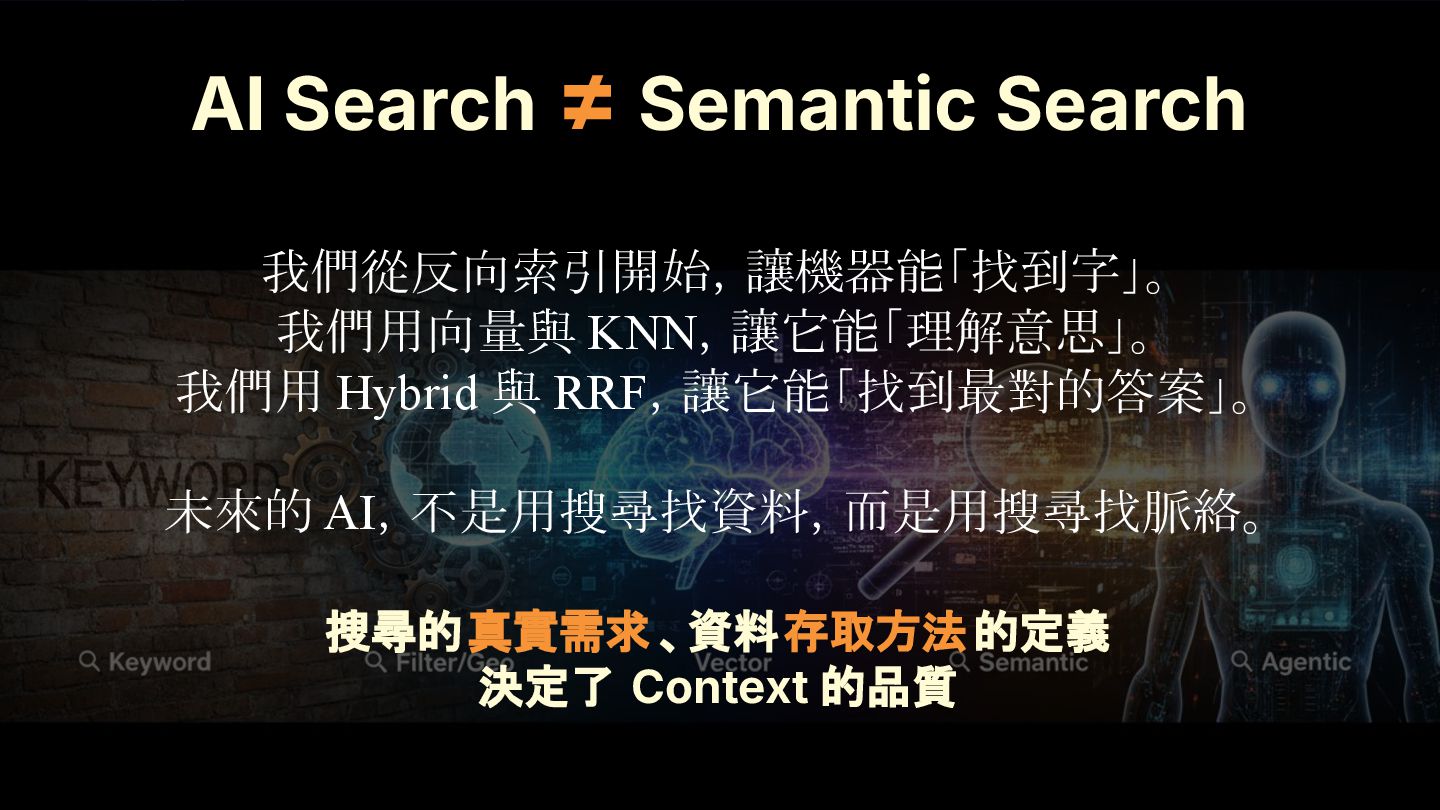 與 RRF,讓它能「找到最對的答案」。 未來的 AI,不是用搜尋找資料,而是用搜尋找脈絡。 搜尋的真實需求、資料存取方法的定義 決定了 Context 的品質