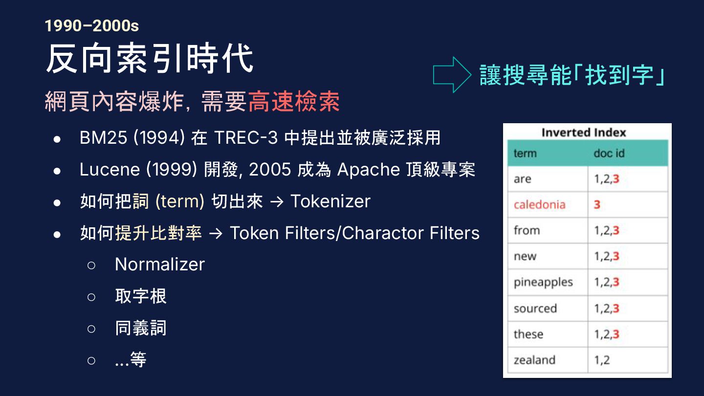 1999 開發, 2005 成為 Apache 頂級專案 • 如何把詞 (term) 切出來 → Tokenizer • 如何提升比對率 → Token Filters/Charactor Filters ◦ Normalizer ◦ 取字根 ◦ 同義詞 ◦ …等 1990–2000s 讓搜尋能「找到字」