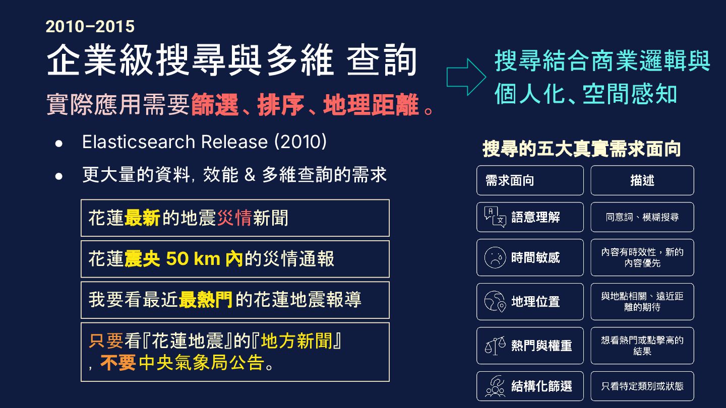 成為主流 反向索引時代 1990–2000s 搜尋的意義與影響 2023-2024 為什麼會出現 關鍵技術 / 事件 技術階段 時期 2025 找 得 到 能 理 解 搜尋技術的演進 搜尋結合商業邏輯與 個人化、空間感知 實際應用需要篩選、 排序、地理距離。 Elasticsearch(2010) Filter, Function Score, Geo 企業級搜尋與 多維查詢 向量檢索與深度學習 萌芽 Word2Vec (2013) GloVe, fastText BERT (2018) 出現 解決關鍵字搜尋 無法理解語意的問題 語意查詢的新突破 向量欄位進入 搜尋系統 Elasticsearch 7.3 dense_vector Embedding Model 與向量搜尋逐漸成熟 從 term-based 轉向 meaning-based 搜尋