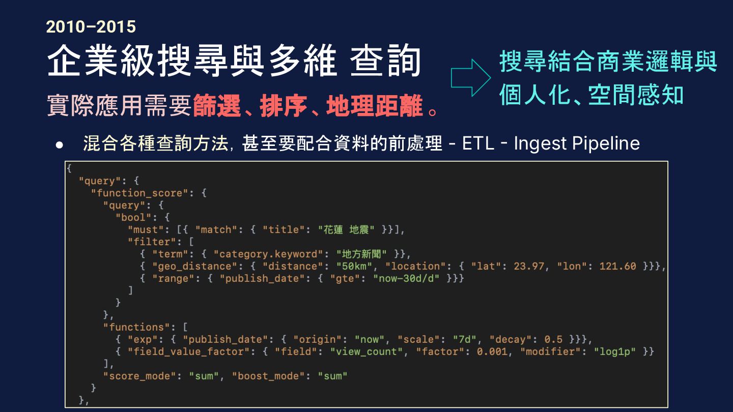 企業級搜尋與多維 查詢 實際應用需要篩選、排序、地理距離。 • 混合各種查詢方法,甚至要配合資料的前處理 - ETL Ingest Pipeline