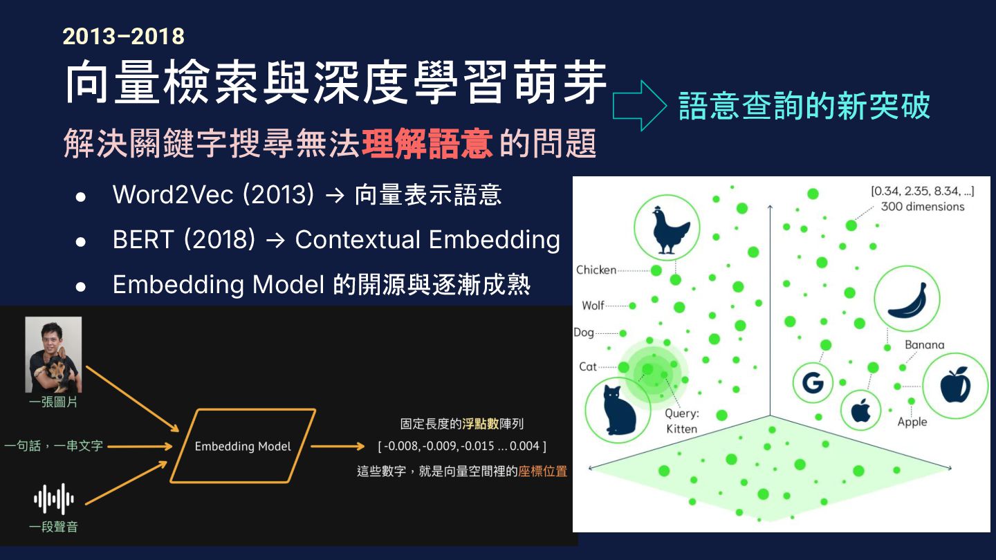 向量檢索與深度學習萌芽 解決關鍵字搜尋無法理解語意的問題 • Word2Vec 2013 → 向量表示語意 • BERT 2018