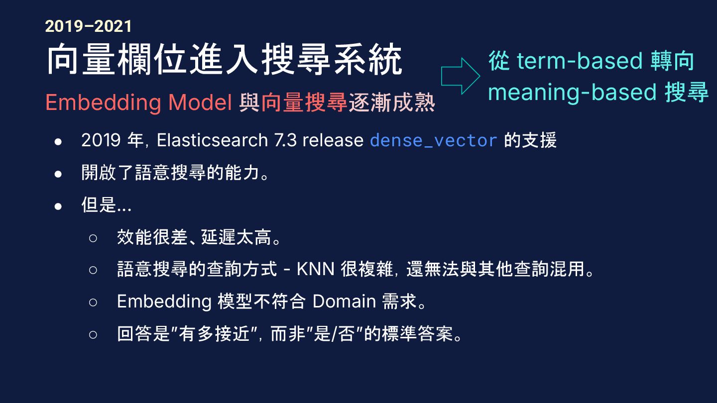 的支援 • 開啟了語意搜尋的能力。 • 但是… ◦ 效能很差、延遲太高。 ◦ 語意搜尋的查詢方式 - KNN 很複雜,還無法與其他查詢混用。 ◦ Embedding 模型不符合 Domain 需求。 ◦ 回答是ˮ有多接近ˮ,而非ˮ是/否ˮ的標準答案。 從 term-based 轉向 meaning-based 搜尋 2019–2021