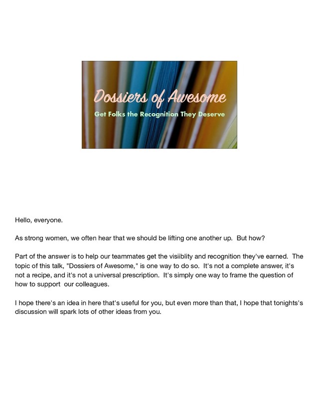 everyone. As strong women, we often hear that we should be lifting one another up. But how? Part of the answer is to help our teammates get the visiiblity and recognition they've earned. The topic of this talk, "Dossiers of Awesome," is one way to do so. It's not a complete answer, it's not a recipe, and it's not a universal prescription. It's simply one way to frame the question of how to support our colleagues. I hope there's an idea in here that's useful for you, but even more than that, I hope that tonights's discussion will spark lots of other ideas from you.