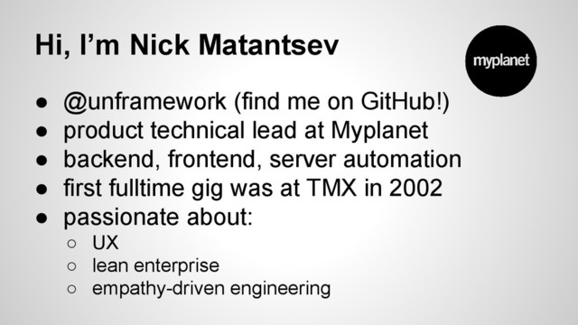 • product technical lead at Myplanet • backend, frontend, server automation • first fulltime gig was at TMX in 2002 • passionate about: ◦ UX ◦ lean enterprise ◦ empathy-driven engineering