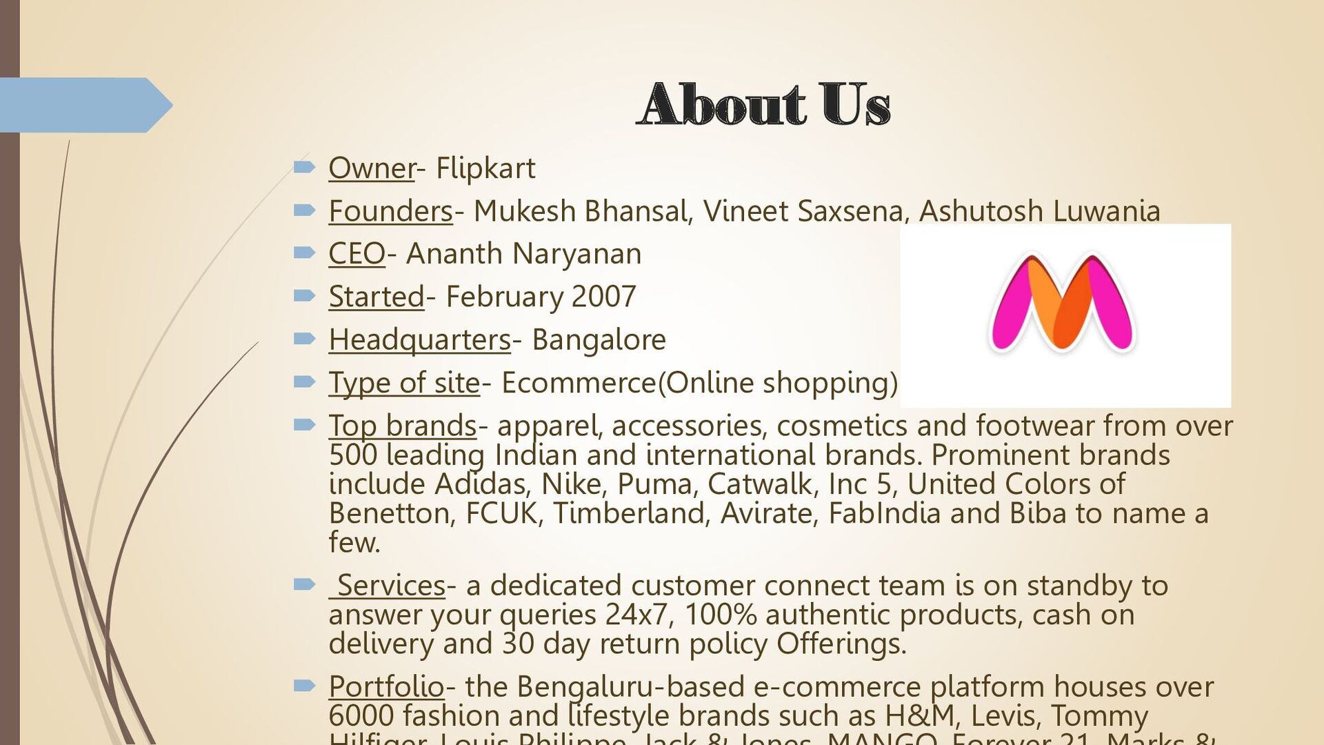 Saxsena, Ashutosh Luwania CEO- Ananth Naryanan Started- February 2007 Headquarters- Bangalore Type of site- Ecommerce(Online shopping) Top brands- apparel, accessories, cosmetics and footwear from over 500 leading Indian and international brands. Prominent brands include Adidas, Nike, Puma, Catwalk, Inc 5, United Colors of Benetton, FCUK, Timberland, Avirate, FabIndia and Biba to name a few. Services- a dedicated customer connect team is on standby to answer your queries 24x7, 100% authentic products, cash on delivery and 30 day return policy Offerings. Portfolio- the Bengaluru-based e-commerce platform houses over 6000 fashion and lifestyle brands such as H&M, Levis, Tommy