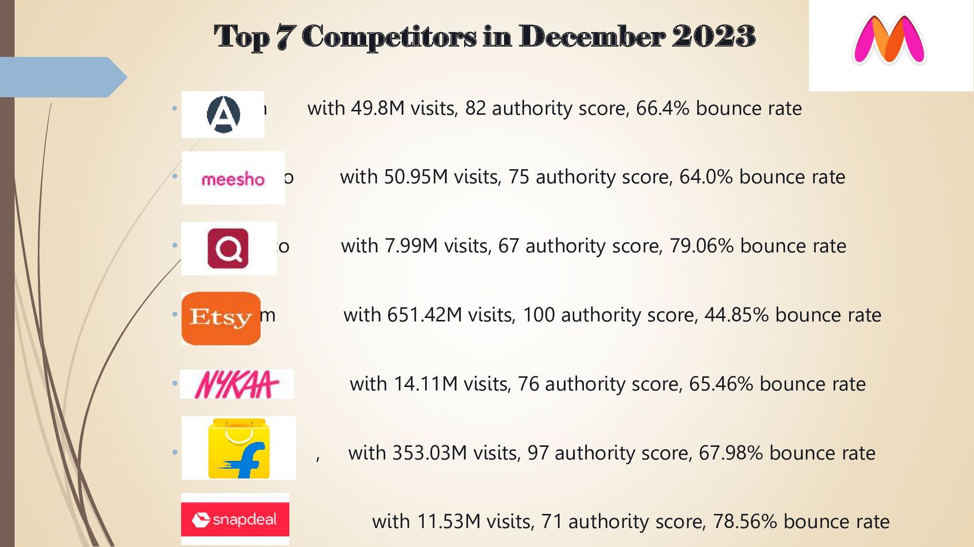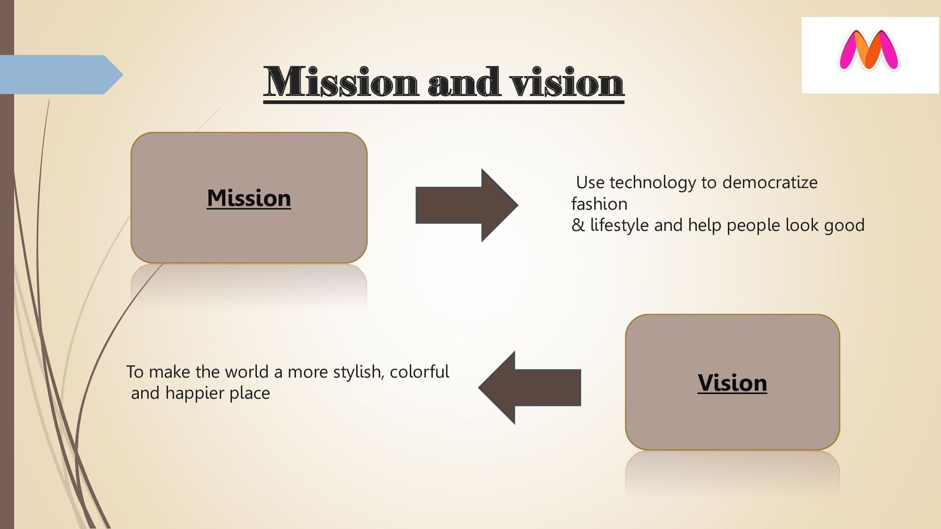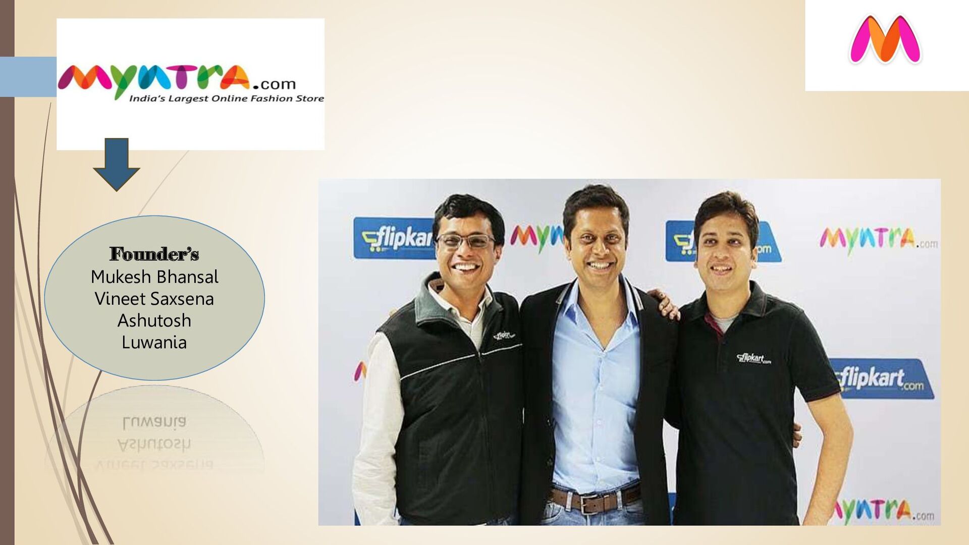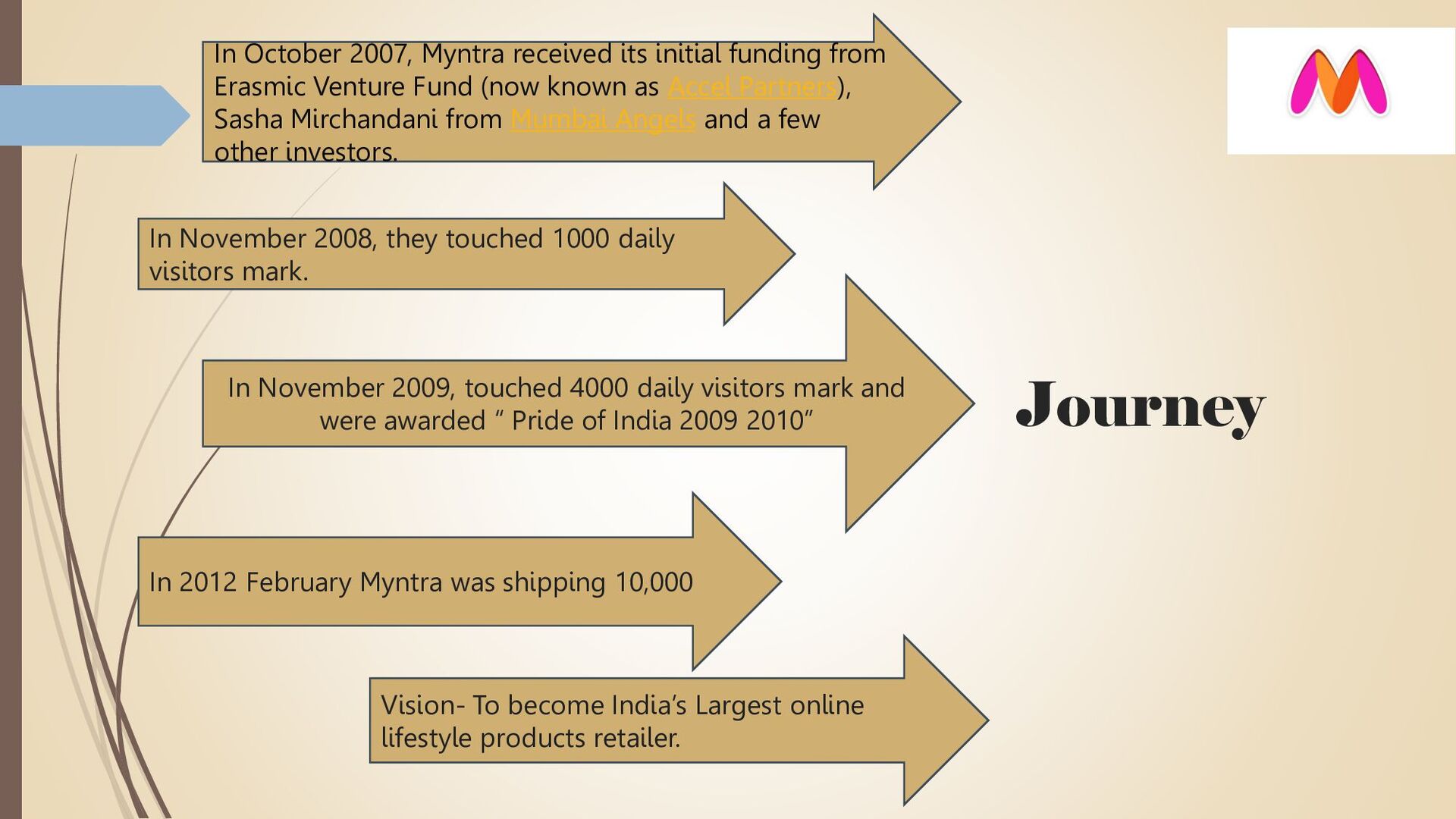 Erasmic Venture Fund (now known as Accel Partners), Sasha Mirchandani from Mumbai Angels and a few other investors. In November 2008, they touched 1000 daily visitors mark. In November 2009, touched 4000 daily visitors mark and were awarded “ Pride of India 2009 2010” In 2012 February Myntra was shipping 10,000 Vision- To become India’s Largest online lifestyle products retailer.