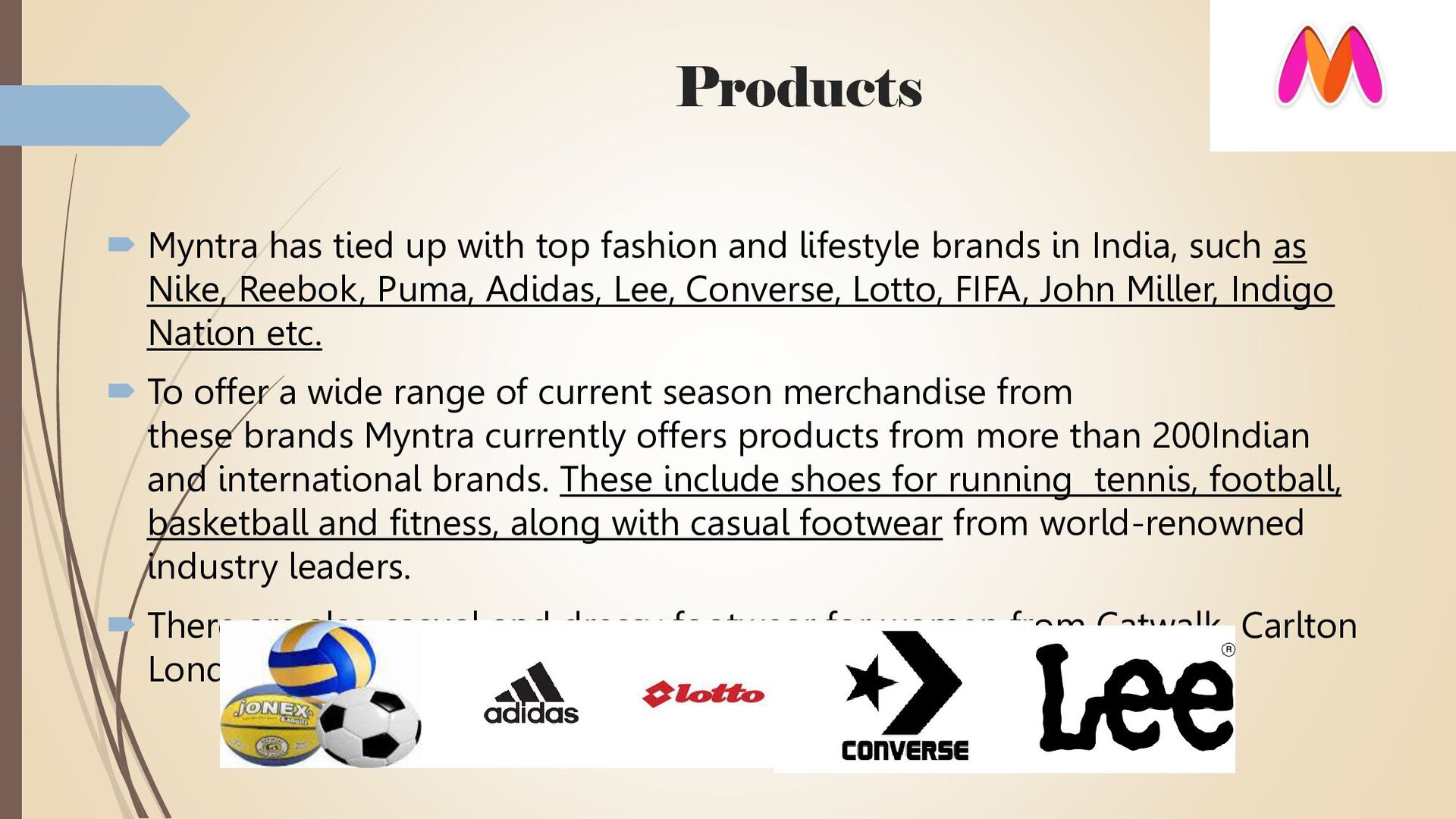 lifestyle brands in India, such as Nike, Reebok, Puma, Adidas, Lee, Converse, Lotto, FIFA, John Miller, Indigo Nation etc. To offer a wide range of current season merchandise from these brands Myntra currently offers products from more than 200Indian and international brands. These include shoes for running tennis, football, basketball and fitness, along with casual footwear from world-renowned industry leaders. There are also casual and dressy footwear for women from Catwalk, Carlton London and Red Tape to name a few.
