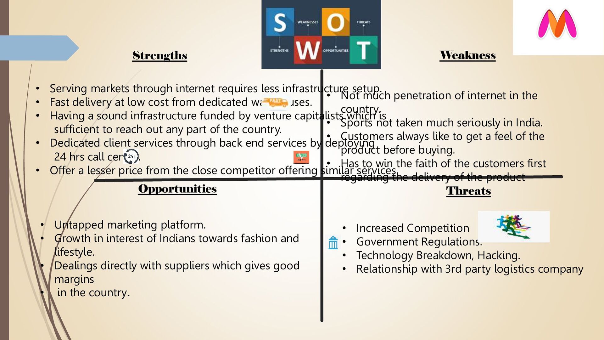 • Fast delivery at low cost from dedicated warehouses. • Having a sound infrastructure funded by venture capitalists which is sufficient to reach out any part of the country. • Dedicated client services through back end services by deploying 24 hrs call centre. • Offer a lesser price from the close competitor offering similar services. Weakness • Not much penetration of internet in the country. • Sports not taken much seriously in India. • Customers always like to get a feel of the product before buying. • Has to win the faith of the customers first regarding the delivery of the product Opportunities • Untapped marketing platform. • Growth in interest of Indians towards fashion and lifestyle. • Dealings directly with suppliers which gives good margins • in the country. Threats • Increased Competition • Government Regulations. • Technology Breakdown, Hacking. • Relationship with 3rd party logistics company