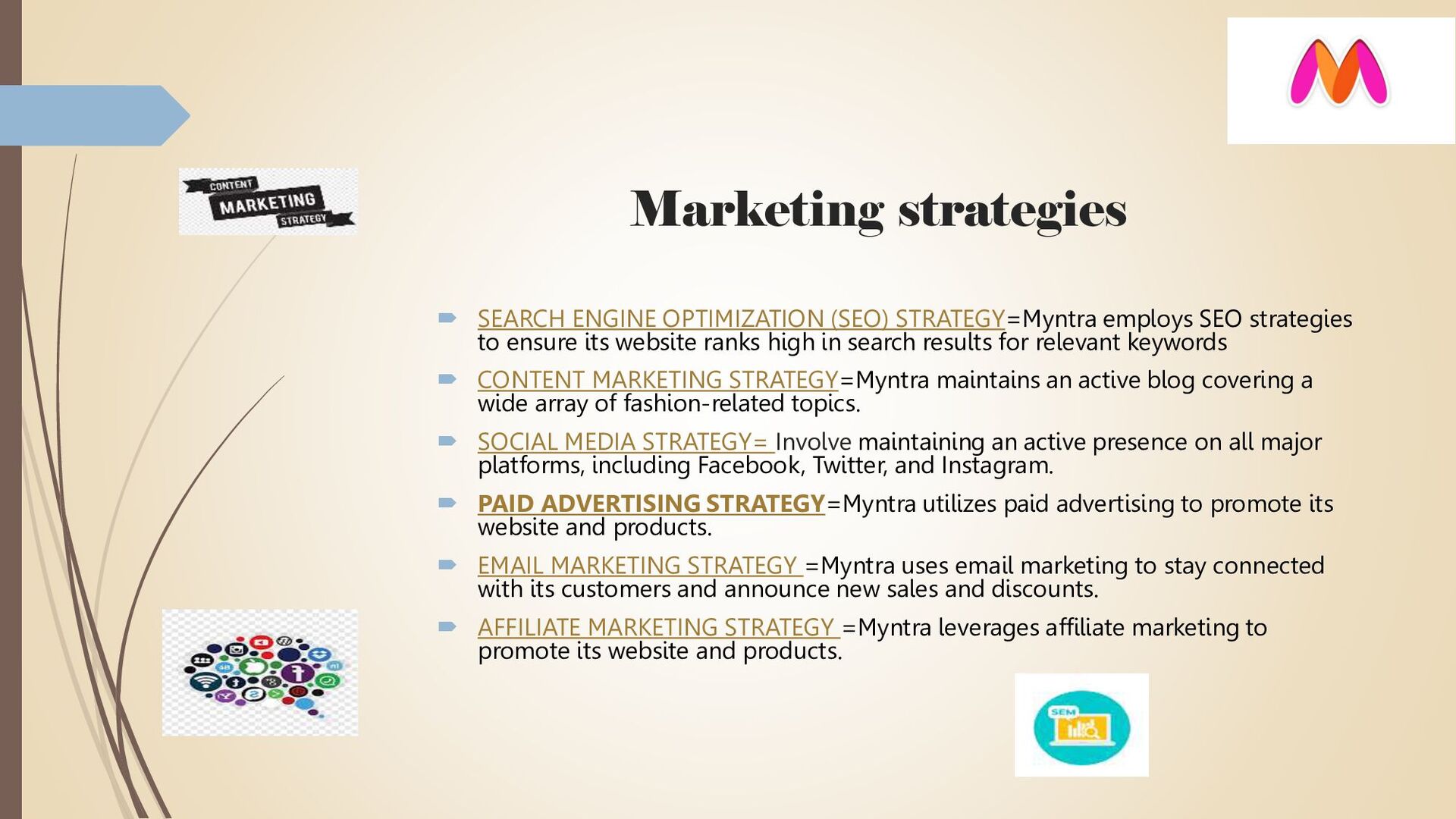 strategies to ensure its website ranks high in search results for relevant keywords CONTENT MARKETING STRATEGY=Myntra maintains an active blog covering a wide array of fashion-related topics. SOCIAL MEDIA STRATEGY= Involve maintaining an active presence on all major platforms, including Facebook, Twitter, and Instagram. PAID ADVERTISING STRATEGY=Myntra utilizes paid advertising to promote its website and products. EMAIL MARKETING STRATEGY =Myntra uses email marketing to stay connected with its customers and announce new sales and discounts. AFFILIATE MARKETING STRATEGY =Myntra leverages affiliate marketing to promote its website and products.