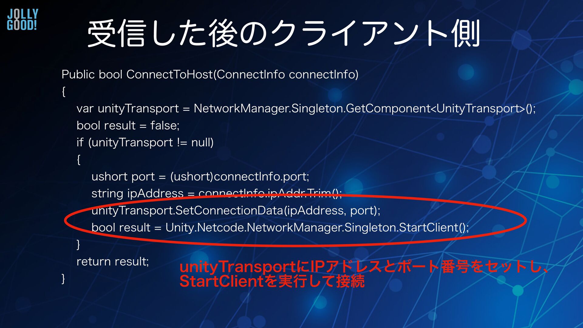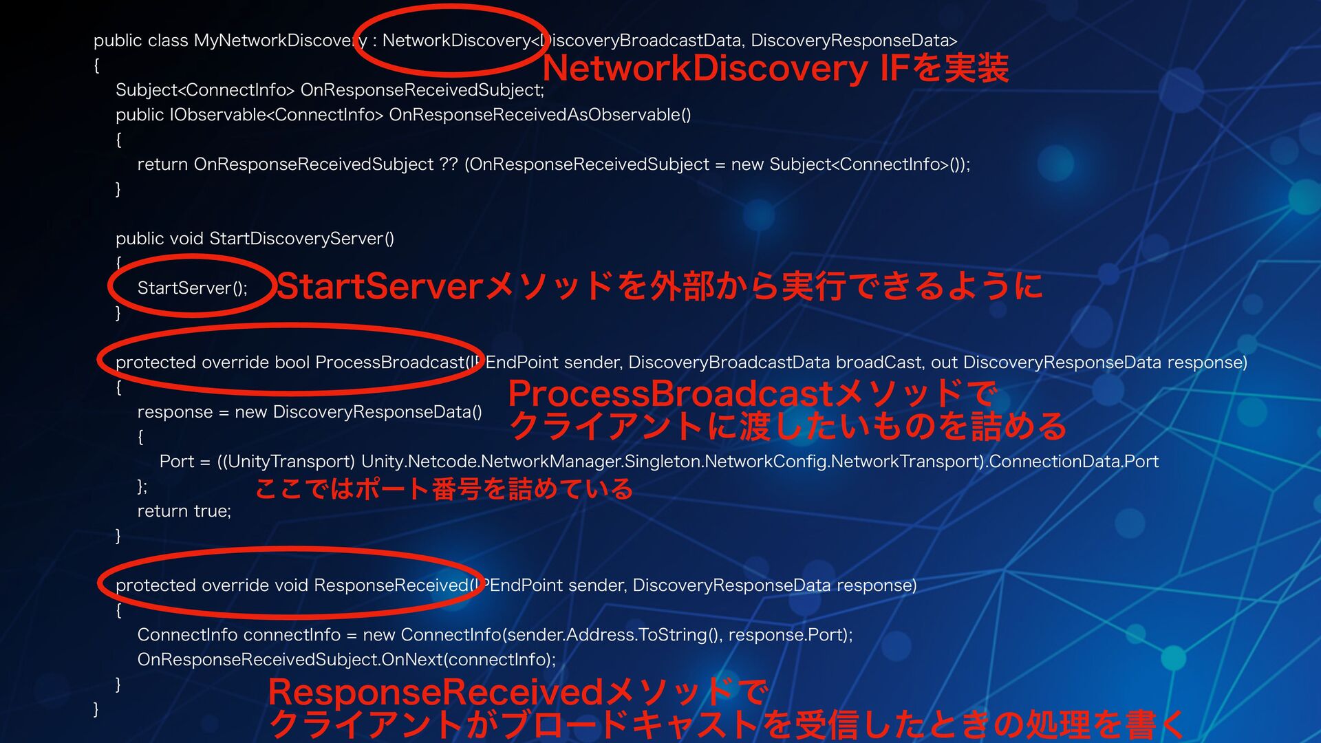^ QVCMJDWPJE4UBSU%JTDPWFSZ4FSWFS \ 4UBSU4FSWFS ^ QSPUFDUFEPWFSSJEFCPPM1SPDFTT#SPBEDBTU *1&OE1PJOUTFOEFS %JTDPWFSZ#SPBEDBTU%BUBCSPBE$BTU PVU%JTDPWFSZ3FTQPOTF%BUBSFTQPOTF \ SFTQPOTFOFX%JTDPWFSZ3FTQPOTF%BUB \ 1PSU 6OJUZ5SBOTQPSU 6OJUZ/FUDPEF/FUXPSL.BOBHFS4JOHMFUPO/FUXPSL$PO fi H/FUXPSL5SBOTQPSU $POOFDUJPO%BUB1PSU ^ SFUVSOUSVF ^ QSPUFDUFEPWFSSJEFWPJE3FTQPOTF3FDFJWFE *1&OE1PJOUTFOEFS %JTDPWFSZ3FTQPOTF%BUBSFTQPOTF \ $POOFDU*OGPDPOOFDU*OGPOFX$POOFDU*OGP TFOEFS"EESFTT5P4USJOH SFTQPOTF1PSU 0O3FTQPOTF3FDFJWFE4VCKFDU0O/FYU DPOOFDU*OGP ^ ^ /FUXPSL%JTDPWFSZ*'Λ࣮ 4UBSU4FSWFSϝιουΛ֎෦͔Β࣮ߦͰ͖ΔΑ͏ʹ 1SPDFTT#SPBEDBTUϝιουͰ ΫϥΠΞϯτʹ͍ͨ͠ͷΛ٧ΊΔ 3FTQPOTF3FDFJWFEϝιουͰ ΫϥΠΞϯτ͕ϒϩʔυΩϟετΛड৴ͨ͠ͱ͖ͷॲཧΛॻ͘ ͜͜Ͱϙʔτ൪߸Λ٧Ί͍ͯΔ