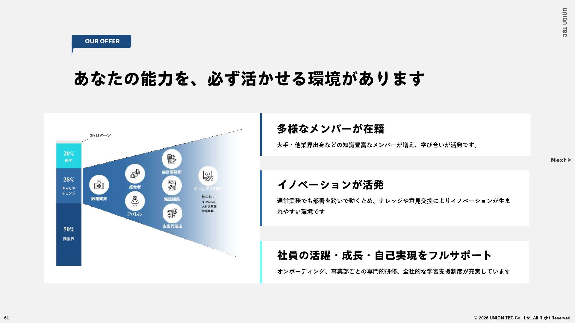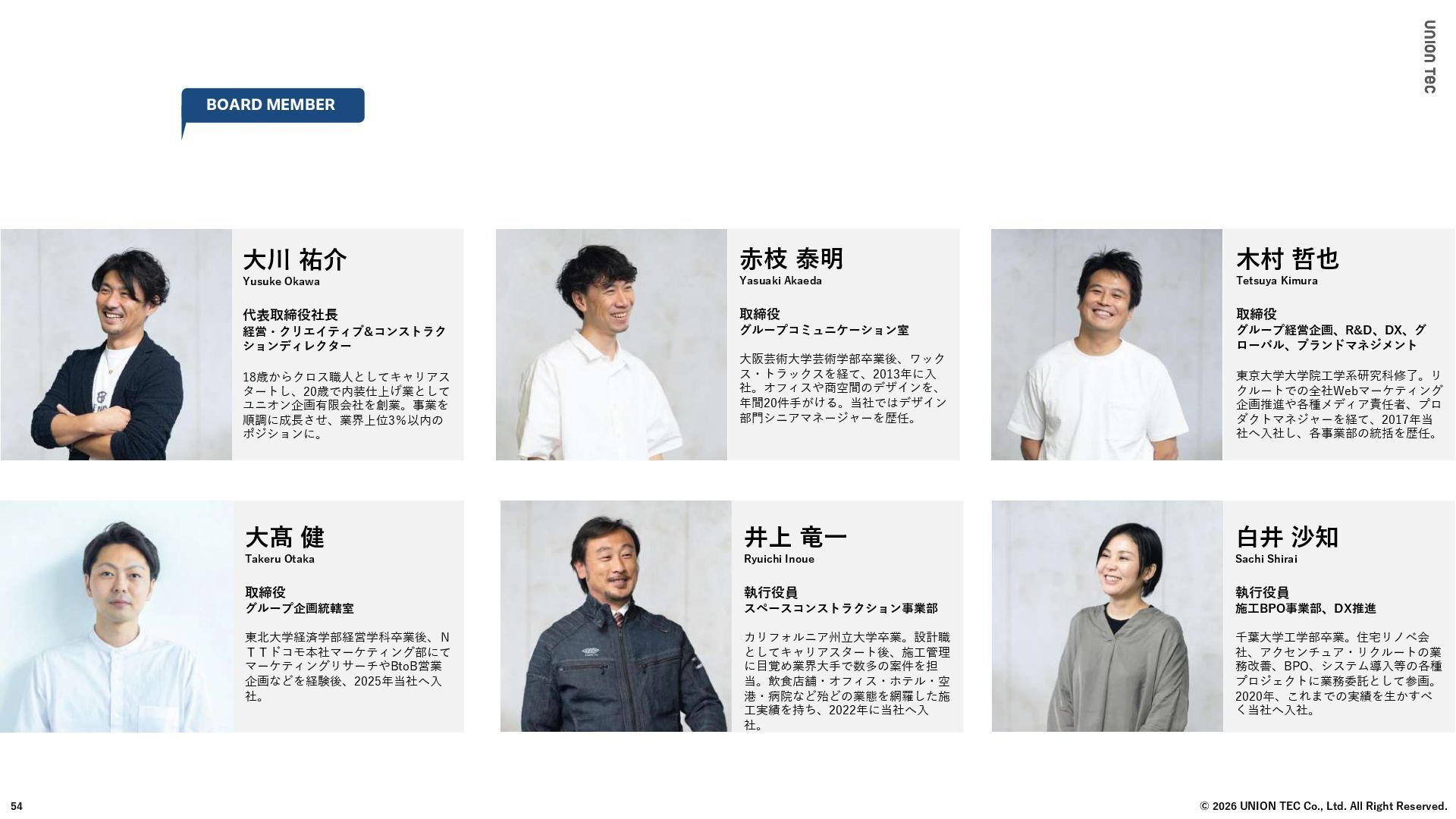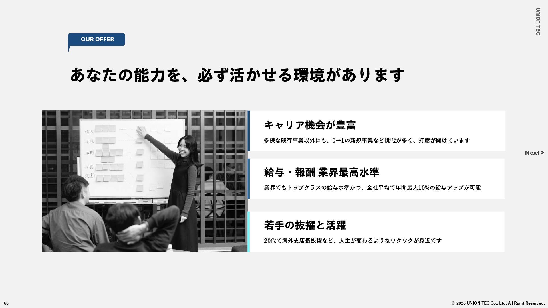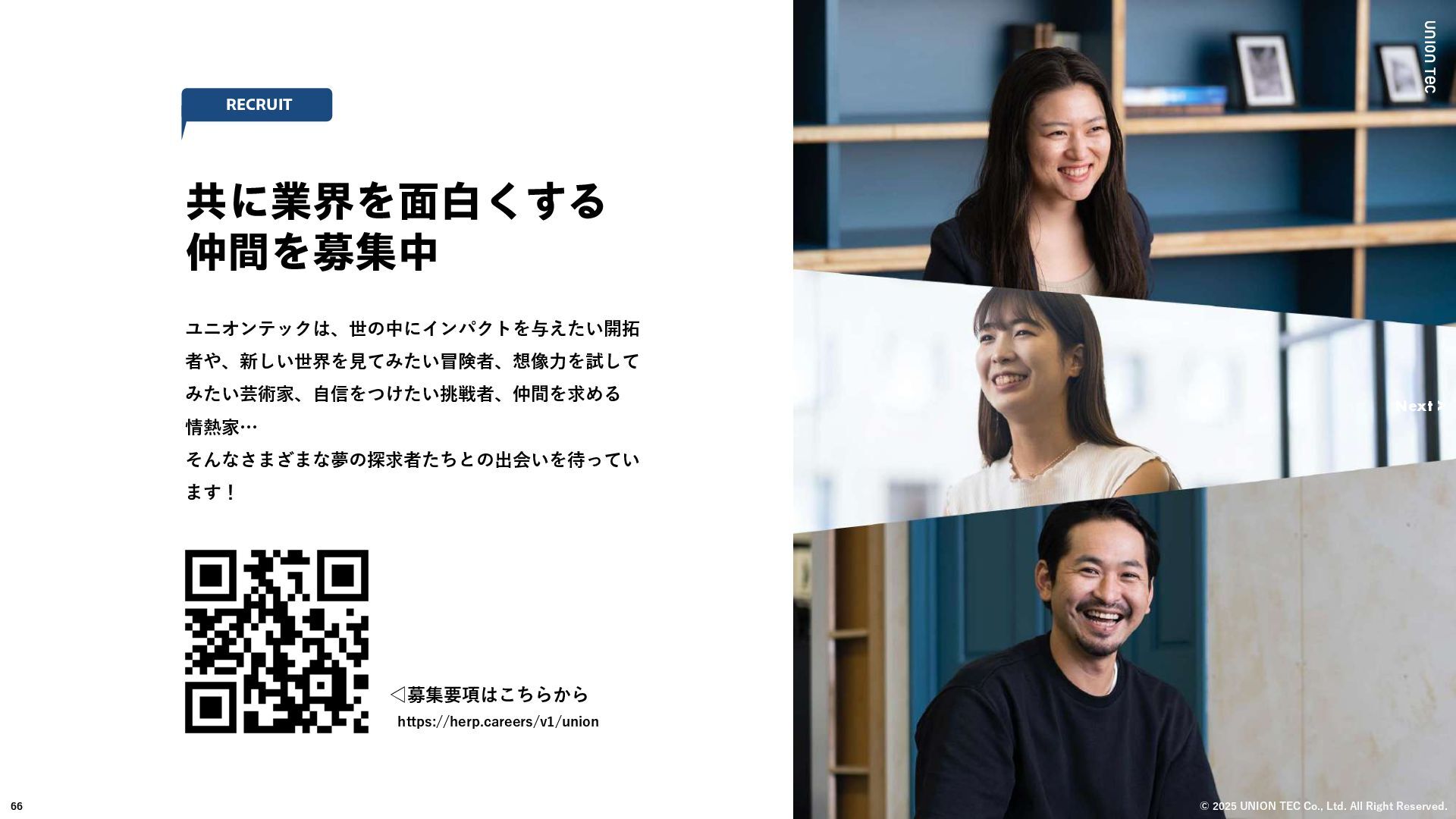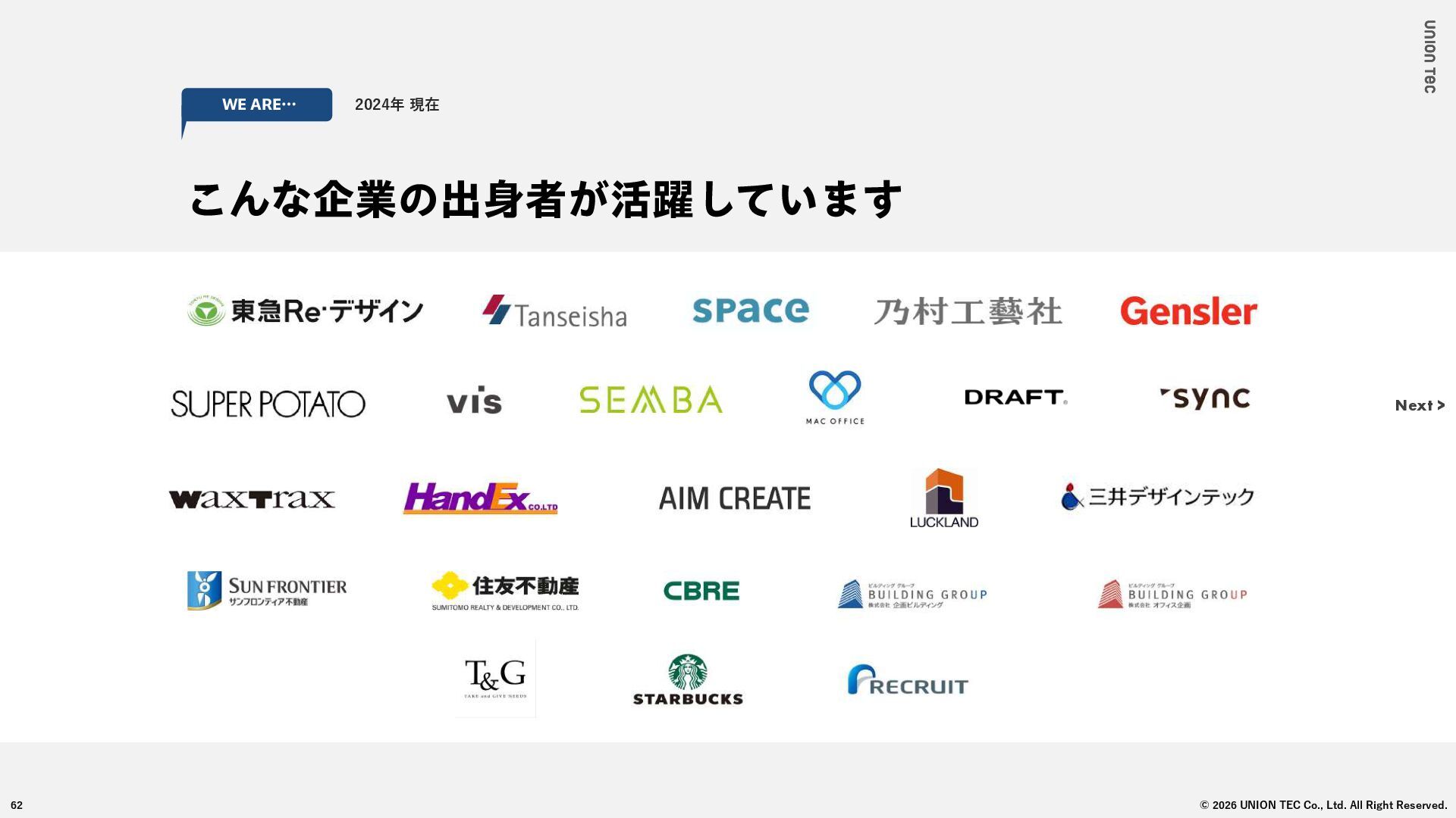 > ߴ͍ࢿۚྗ 11 © 2025 UNION TEC Co., Ltd. All Right Reserved. ߴ͍ࢿۚྗ ▼昨期(25期)主要業績 売上⾼:101.1億円(前年⽐164%) 粗利:25.6億円(前年⽐148%) ⼀⼈当たり粗利:3.1千万円 (前年⽐146%) \0 \5 ,00 0,00 0 \1 0,0 00,0 00 \1 5,0 00,0 00 \2 0,0 00,0 00 \2 5,0 00,0 00 \3 0,0 00,0 00 \3 5,0 00,0 00 0 2, 000 ,000 ,00 0 4, 000 ,000 ,00 0 6, 000 ,000 ,00 0 8, 000 ,000 ,00 0 10 ,00 0,00 0,0 00 12 ,00 0,00 0,0 00 合計 / 売上額 ⼀⼈当たり粗利 ԯ ԯ ԯ ԯ ԯ ઍສԁ ઍສԁ ઍສԁ ઍສԁ ઍສԁ SALES ORDER डച্ cҰਓͨΓૈར