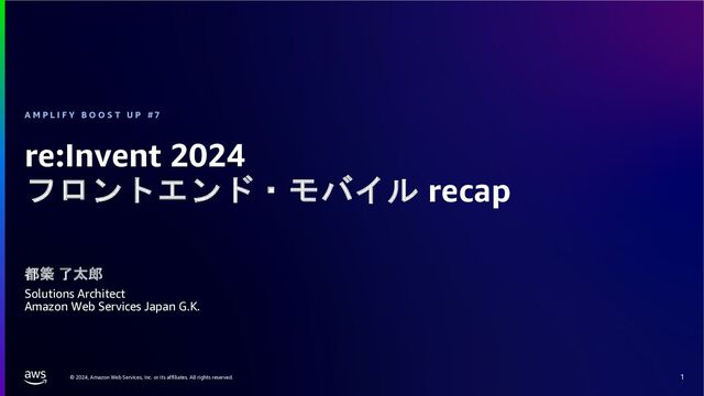 rights reserved. フロントエンド・モバイル関連セッション 5 • AWS Amplify • Full-stack AI with the AWS Amplify AI kit (FWM202) • Startup to enterprise: Build frontend and fullstack apps that scale (FWM205) • What‘s new in AWS for frontend developers (FWM311) • AWS AppSync • I didn't know AWS AppSync could do that! (FWM203) • Real-time event patterns with WebSockets and AWS AppSync (FWM302) • Build an AI gateway for Amazon Bedrock with AWS AppSync (FWM310) • AWS Device Farm • Optimizing the world's top apps: How Meta tests using AWS Device Farm (FWM204)