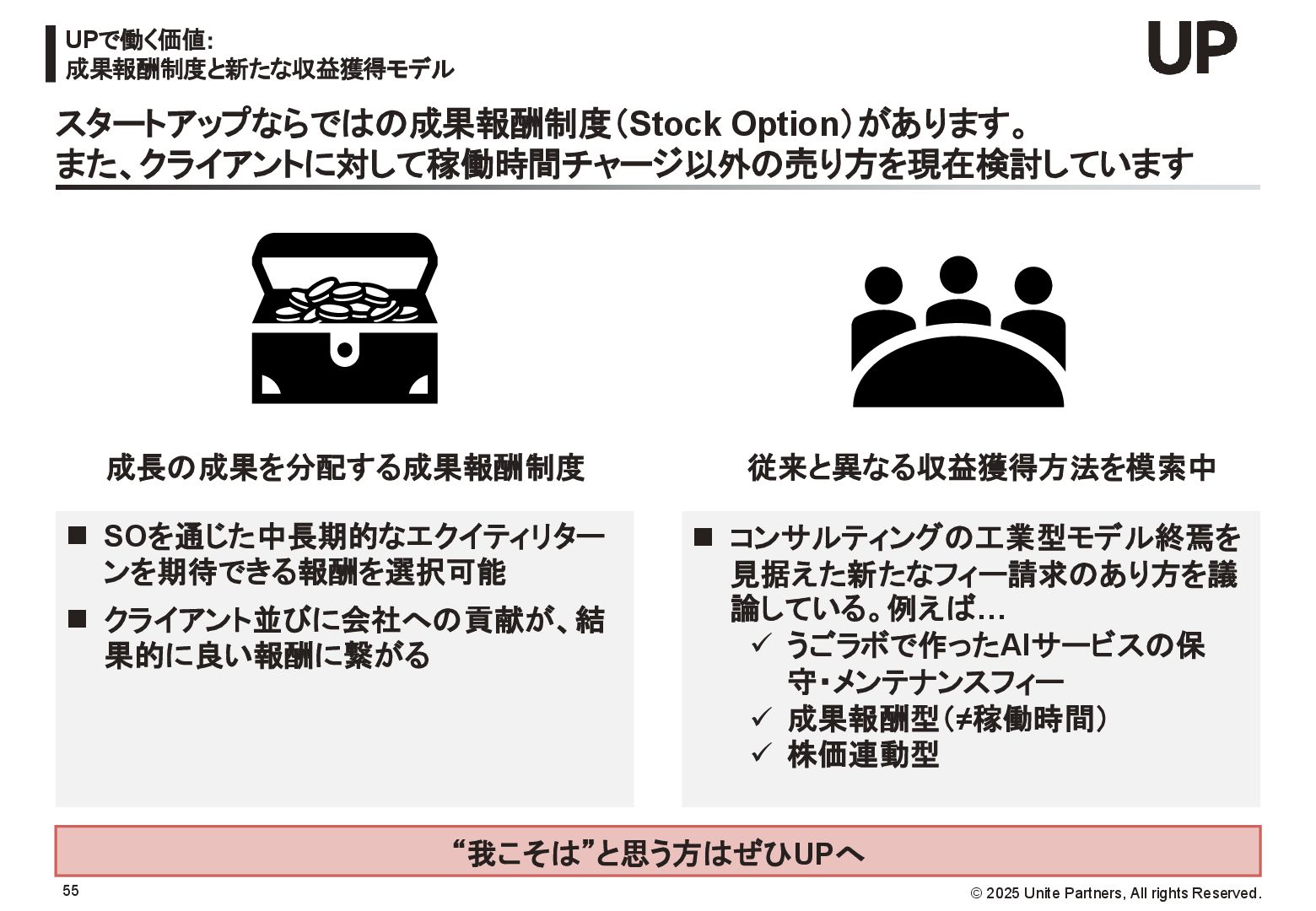 © 2025 Unite Partners, All rights Reserved. 55 UPで働く価値: 成果報酬制度と新たな収益獲得モデル
