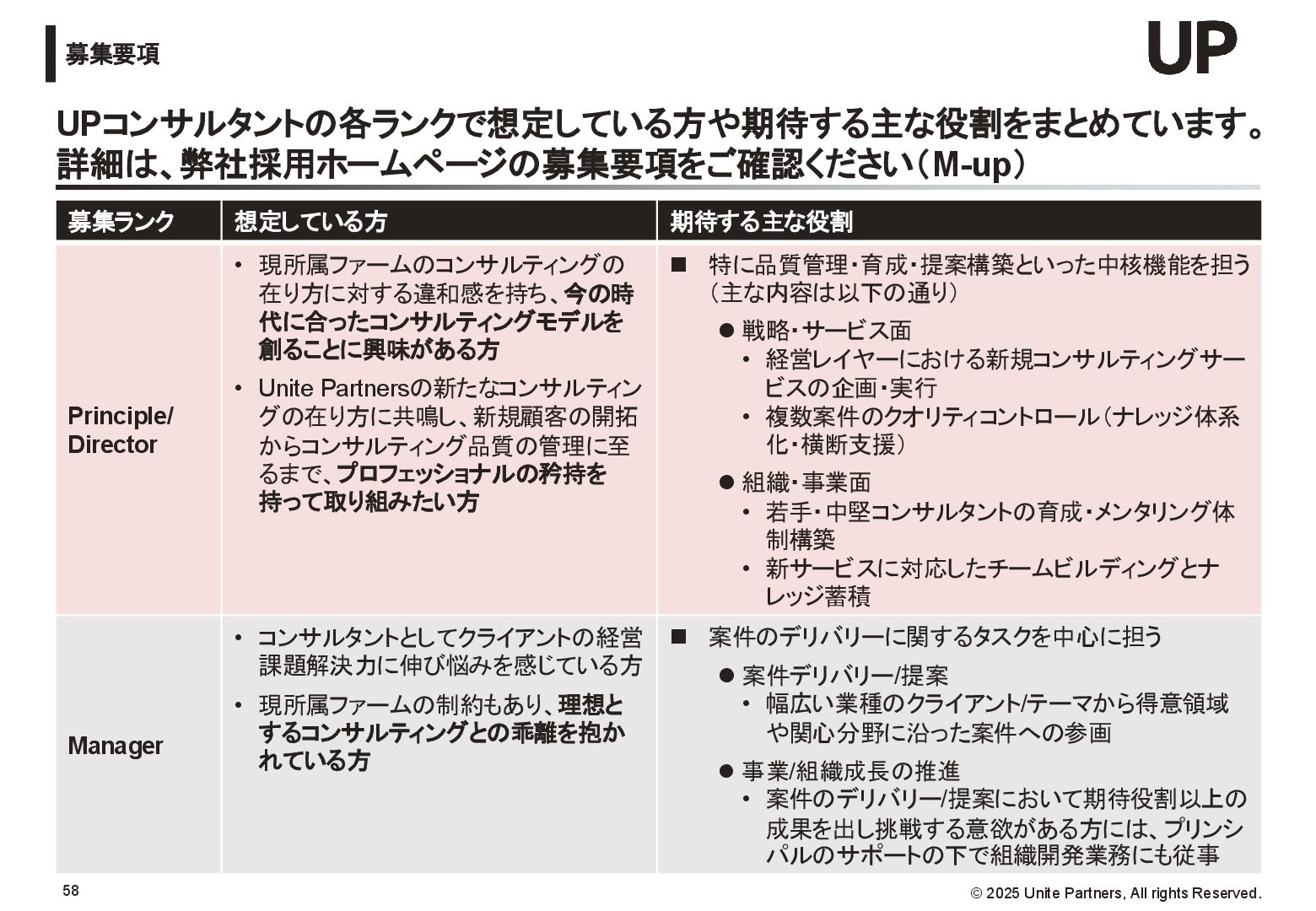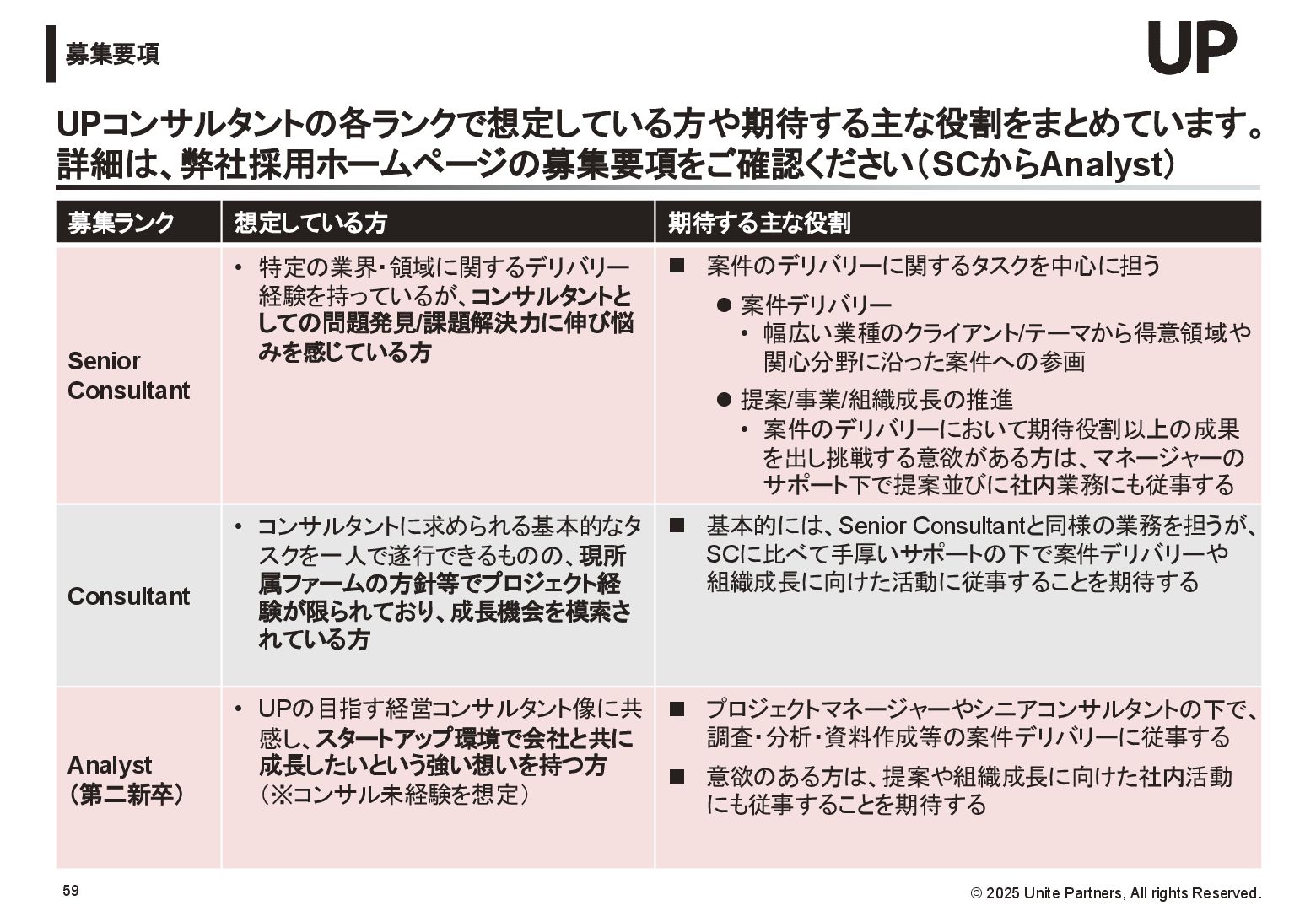 © 2025 Unite Partners, All rights Reserved. 58 募集要項 UPコンサルタントの各ランクで想定している方や期待する主な役割をまとめています。