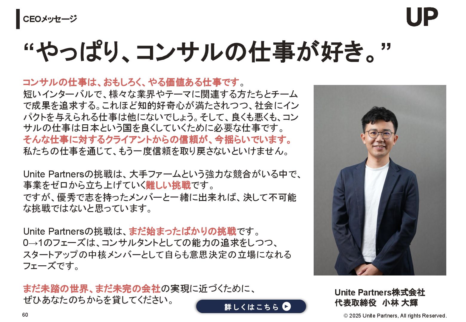 © 2025 Unite Partners, All rights Reserved. 60 CEOメッセージ “やっぱり、コンサルの仕事が好き。”