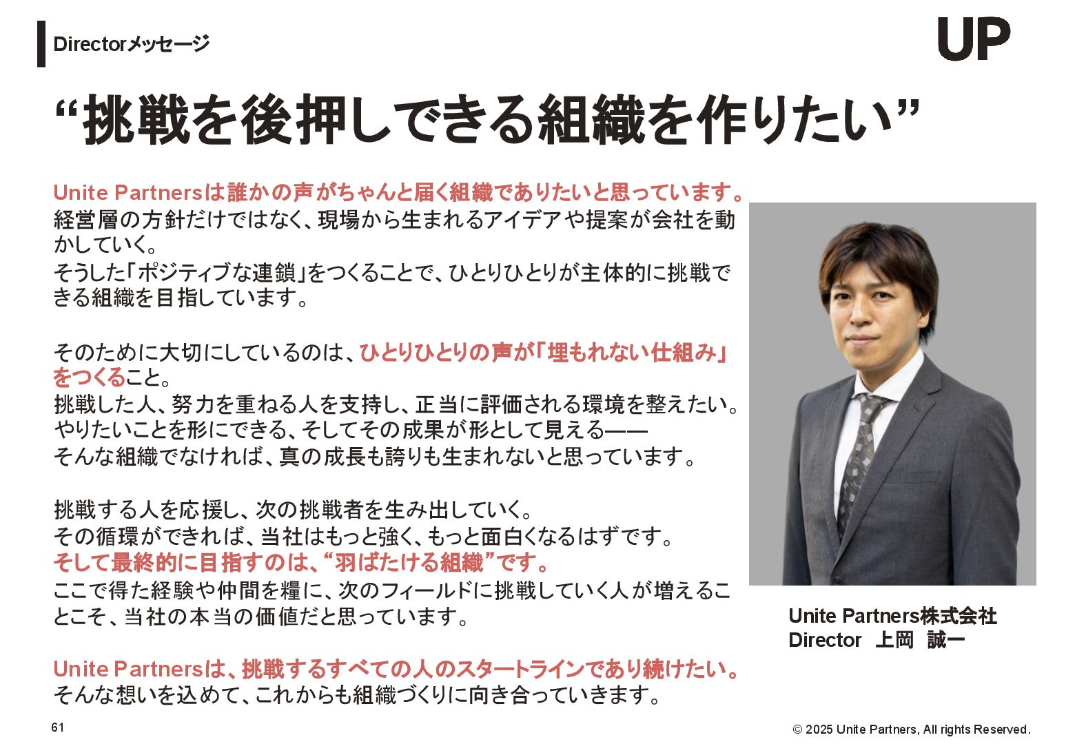 © 2025 Unite Partners, All rights Reserved. 61 Directorメッセージ “挑戦を後押しできる組織を作りたい”