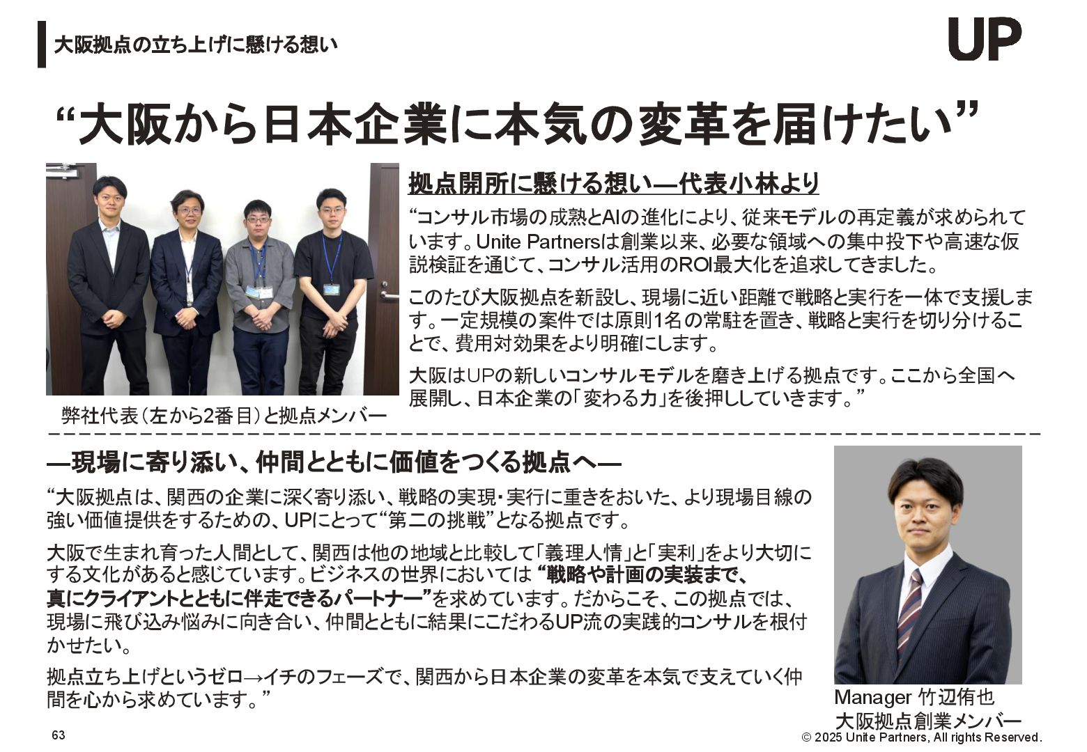 © 2025 Unite Partners, All rights Reserved. 63 大阪拠点の立ち上げに懸ける想い “大阪から日本企業に本気の変革を届けたい”
