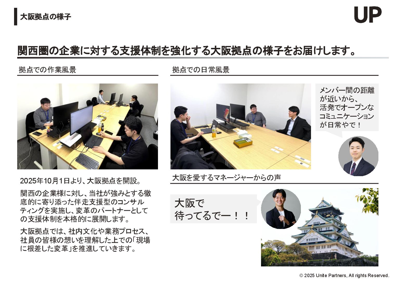 © 2025 Unite Partners, All rights Reserved. 大阪拠点の様子 関西圏の企業に対する支援体制を強化する大阪拠点の様子をお届けします。 2025年10月1日より、大阪拠点を開設。