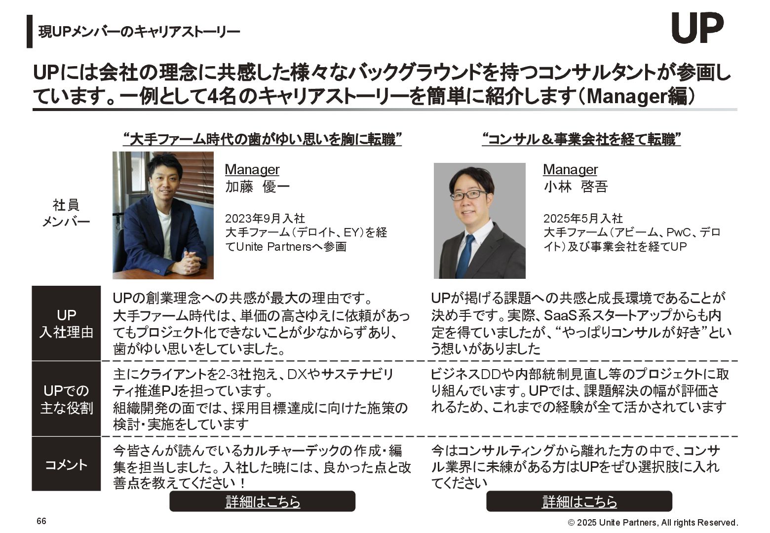 ています。一例として4名のキャリアストーリーを簡単に紹介します(Manager編) UP 入社理由 UPでの 主な役割 コメント “大手ファーム時代の歯がゆい思いを胸に転職” UPの創業理念への共感が最大の理由です。 大手ファーム時代は、単価の高さゆえに依頼があっ てもプロジェクト化できないことが少なからずあり、 歯がゆい思いをしていました。 主にクライアントを2-3社抱え、DXやサステナビリ ティ推進PJを担っています。 組織開発の面では、採用目標達成に向けた施策の 検討・実施をしています 今皆さんが読んでいるカルチャーデックの作成・編 集を担当しました。入社した暁には、良かった点と改 善点を教えてください! 詳細はこちら 社員 メンバー Manager 加藤 優一 2023年9月入社 大手ファーム(デロイト、EY)を経 てUnite Partnersへ参画 UPが掲げる課題への共感と成長環境であることが 決め手です。実際、SaaS系スタートアップからも内 定を得ていましたが、“やっぱりコンサルが好き”とい う想いがありました ビジネスDDや内部統制見直し等のプロジェクトに取 り組んでいます。UPでは、課題解決の幅が評価さ れるため、これまでの経験が全て活かされています 今はコンサルティングから離れた方の中で、コンサ ル業界に未練がある方はUPをぜひ選択肢に入れ てください “コンサル&事業会社を経て転職” Manager 小林 啓吾 2025年5月入社 大手ファーム(アビーム、PwC、デロ イト)及び事業会社を経てUP 詳細はこちら