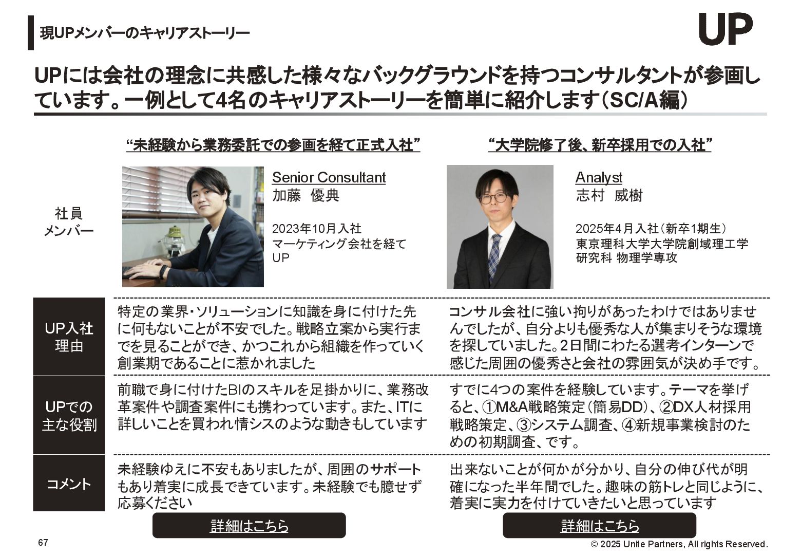 ています。一例として4名のキャリアストーリーを簡単に紹介します(SC/A編) “大学院修了後、新卒採用での入社” 詳細はこちら Senior Consultant 加藤 優典 2023年10月入社 マーケティング会社を経て UP UP入社 理由 UPでの 主な役割 コメント “未経験から業務委託での参画を経て正式入社” 特定の業界・ソリューションに知識を身に付けた先 に何もないことが不安でした。戦略立案から実行ま でを見ることができ、かつこれから組織を作っていく 創業期であることに惹かれました 前職で身に付けたBIのスキルを足掛かりに、業務改 革案件や調査案件にも携わっています。また、ITに 詳しいことを買われ情シスのような動きもしています 未経験ゆえに不安もありましたが、周囲のサポート もあり着実に成長できています。未経験でも臆せず 応募ください 社員 メンバー Analyst 志村 威樹 2025年4月入社(新卒1期生) 東京理科大学大学院創域理工学 研究科 物理学専攻 コンサル会社に強い拘りがあったわけではありませ んでしたが、自分よりも優秀な人が集まりそうな環境 を探していました。2日間にわたる選考インターンで 感じた周囲の優秀さと会社の雰囲気が決め手です。 すでに4つの案件を経験しています。テーマを挙げ ると、①M&A戦略策定(簡易DD)、②DX人材採用 戦略策定、③システム調査、④新規事業検討のた めの初期調査、です。 出来ないことが何かが分かり、自分の伸び代が明 確になった半年間でした。趣味の筋トレと同じように、 着実に実力を付けていきたいと思っています 詳細はこちら