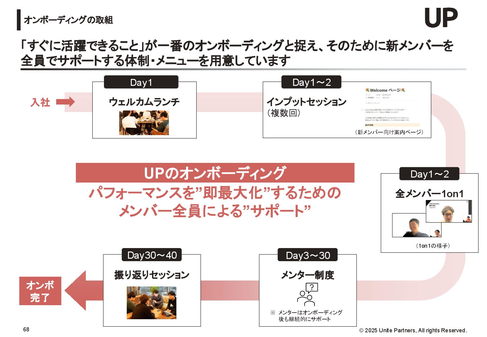 © 2025 Unite Partners, All rights Reserved. 68 オンボーディングの取組 「すぐに活躍できること」が一番のオンボーディングと捉え、そのために新メンバーを