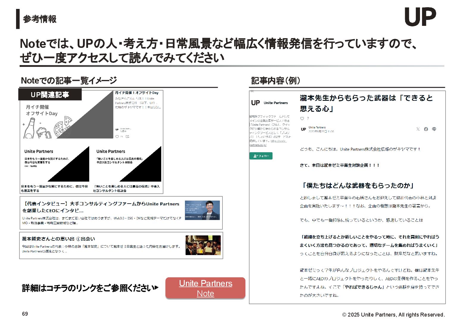 © 2025 Unite Partners, All rights Reserved. 69 参考情報 Noteでは、UPの人・考え方・日常風景など幅広く情報発信を行っていますので、