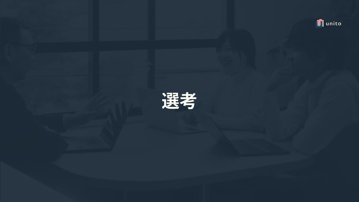毎週 近藤ランチ会 ⼊社時 バディ制度 ⼊社3か⽉間、新メンバー×既存メンバーのバディを組み、新メンバーがunitoに馴染むためのサポートをする制度 フォーラム 任意、1年間、守秘義務に則った場において⾃⾝の感情を内省し、メンバーと感情や経験をシェアすることによって ”⾃⾝で気づいていない⾃⾝の感情”への気づきや学びを獲得する会 リファラル 採⽤制度 2か⽉に⼀度、イベントも実施 家賃‧宿泊割引制度 フルフレックス 制度 コアタイムなし 資格⼿当‧資格受験料補助⼿当 表彰制度 朝会、事業戦略会議での表彰制度 部活動 フットサル部、デザート部、ラン部など