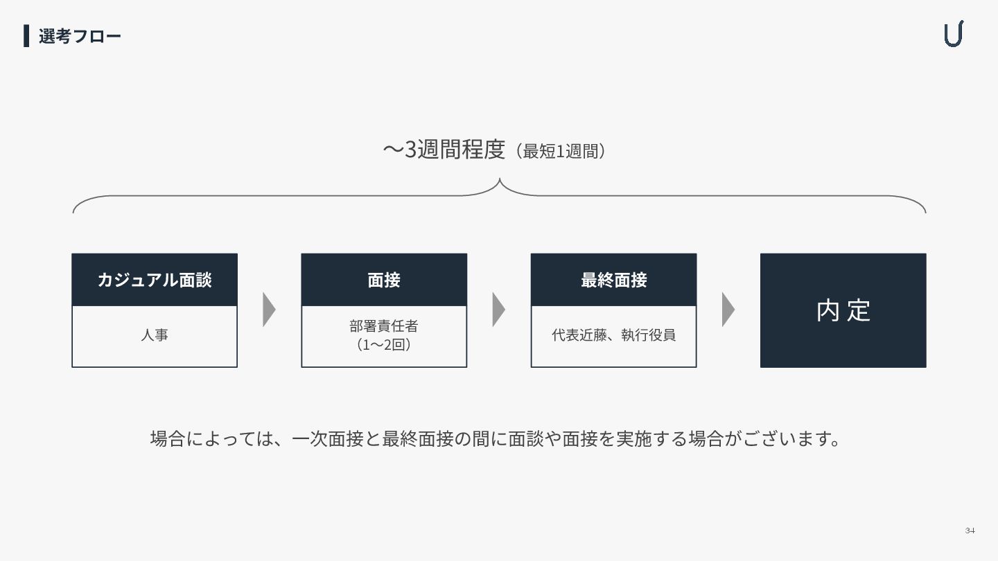 カジュアル⾯談 ⾯接 最終⾯接 場合によっては、⼀次⾯接と最終⾯接の間に⾯談や⾯接を実施する場合がございます。 内 定 〜3週間程度(最短1週間) 34 選考フロー ⼈事