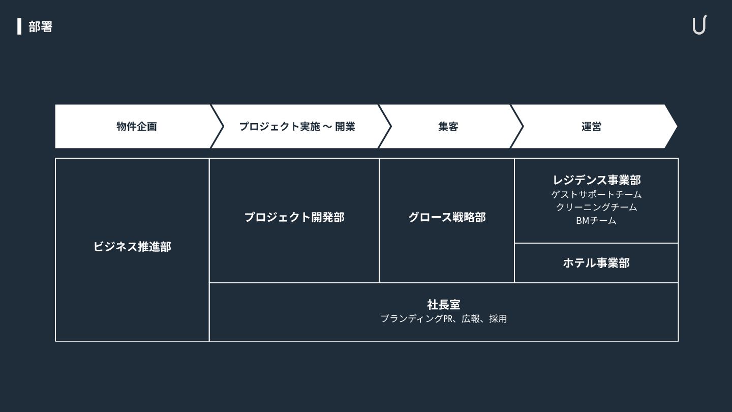 ゲストサポートチーム クリーニングチーム BMチーム ホテル事業部 グロース戦略部 社⻑室 ブランディング㏚、広報、採⽤