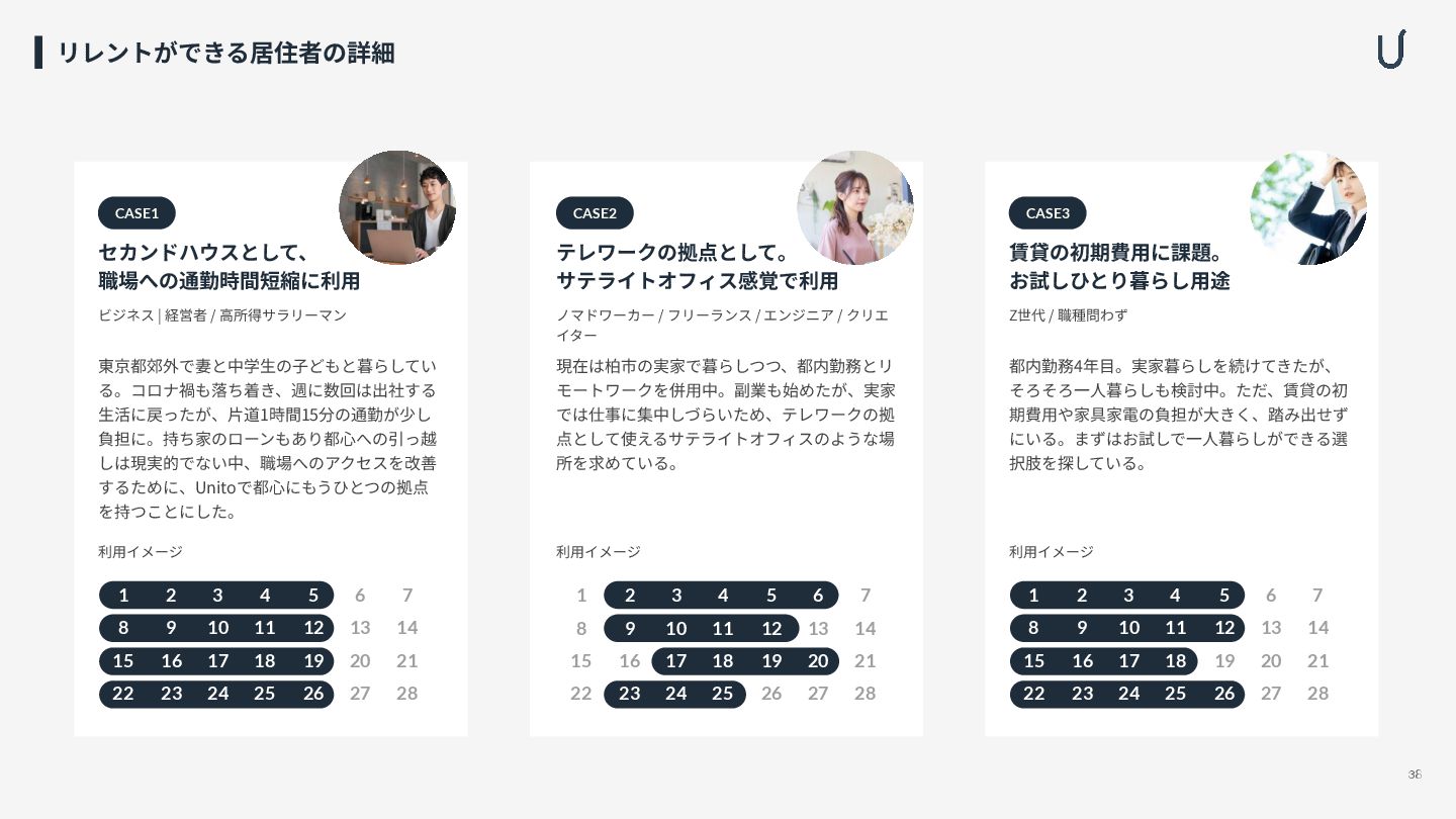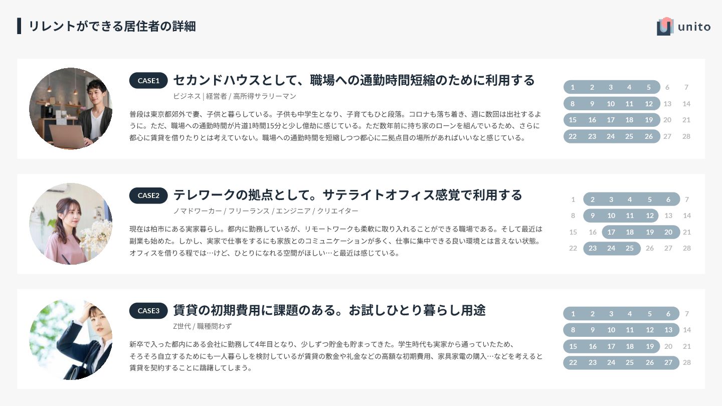 ⽣活に戻ったが、⽚道1時間15分の通勤が少し 負担に。持ち家のローンもあり都⼼への引っ越 しは現実的でない中、職場へのアクセスを改善 するために、Unitoで都⼼にもうひとつの拠点 を持つことにした。 CASE1 1 2 3 4 5 6 7 8 9 10 11 12 13 14 15 16 17 18 19 20 21 22 23 24 25 26 27 28 利⽤イメージ テレワークの拠点として。 サテライトオフィス感覚で利⽤ ノマドワーカー / フリーランス / エンジニア / クリエ イター 現在は柏市の実家で暮らしつつ、都内勤務とリ モートワークを併⽤中。副業も始めたが、実家 では仕事に集中しづらいため、テレワークの拠 点として使えるサテライトオフィスのような場 所を求めている。 CASE2 1 2 3 4 5 6 7 8 9 10 11 12 13 14 15 16 17 18 19 20 21 22 23 24 25 26 27 28 利⽤イメージ 賃貸の初期費⽤に課題。 お試しひとり暮らし⽤途 Z世代 / 職種問わず 都内勤務4年⽬。実家暮らしを続けてきたが、 そろそろ⼀⼈暮らしも検討中。ただ、賃貸の初 期費⽤や家具家電の負担が⼤きく、踏み出せず にいる。まずはお試しで⼀⼈暮らしができる選 択肢を探している。 CASE3 1 2 3 4 5 6 7 8 9 10 11 12 13 14 15 16 17 18 19 20 21 22 23 24 25 26 27 28 利⽤イメージ 38