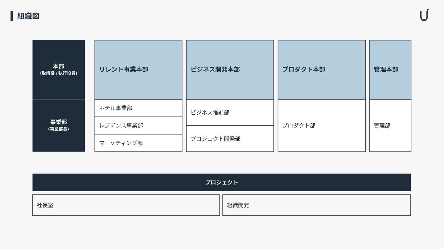 組織図 本部(取締役 / 執⾏役員) リレント事業本部 ホテル事業部 レジデンス事業部 グロース戦略部 事業部(事業部⻑) ビジネス開発本部