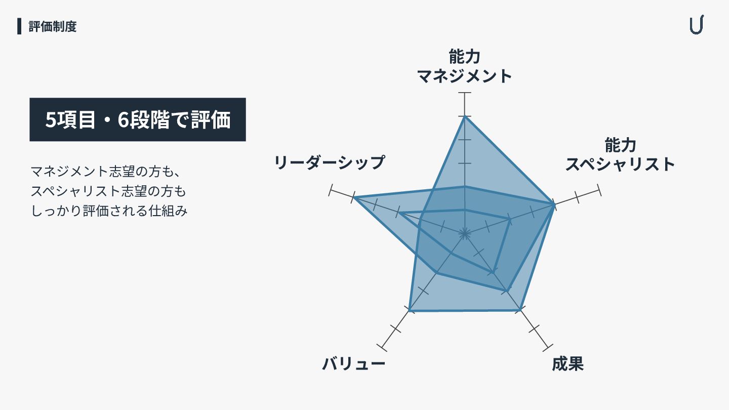 5項⽬‧6段階で評価 マネジメント志望の⽅も、 スペシャリスト志望の⽅も しっかり評価される仕組み 評価制度 能⼒ マネジメント 能⼒ スペシャリスト リーダーシップ