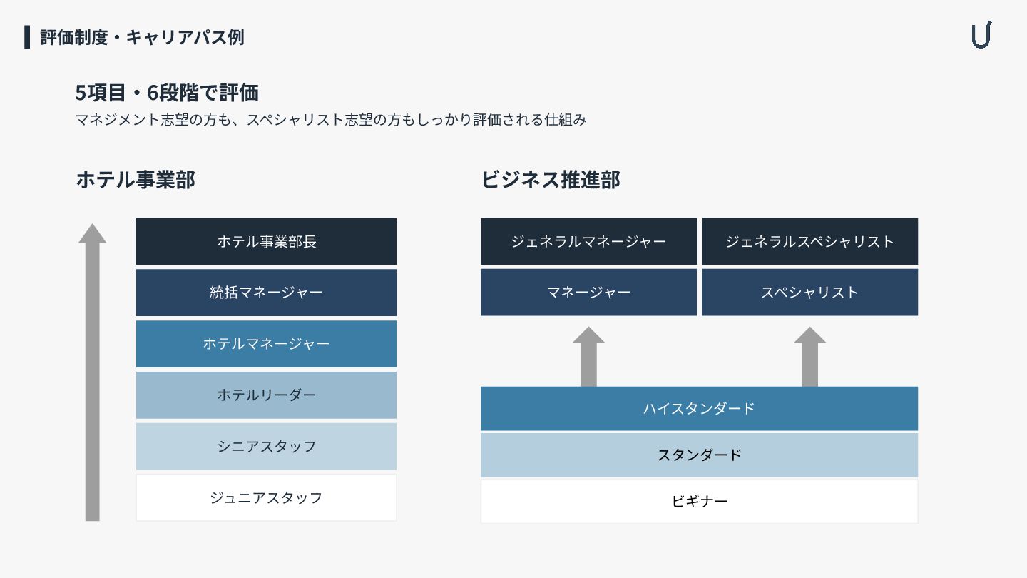 ジュニアスタッフ シニアスタッフ ホテルリーダー ホテルマネージャー 統括マネージャー ホテル事業部⻑ ホテル事業部 ビギナー スタンダード ハイスタンダード