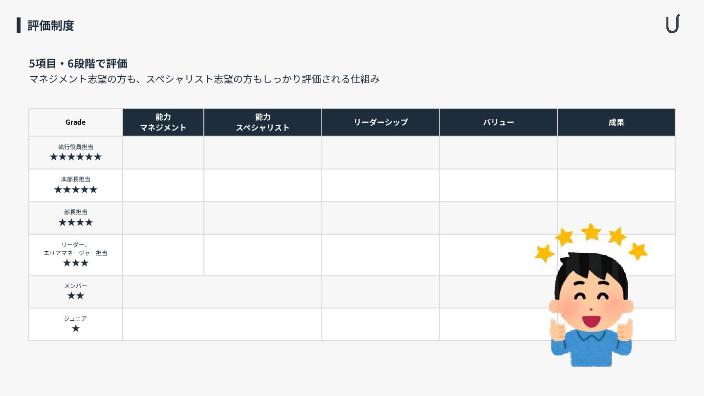 成果 執⾏役員担当 ★★★★★★ 本部⻑担当 ★★★★★ 部⻑担当 ★★★★ リーダー、 エリアマネージャー担当 ★★★ メンバー ★★ ジュニア ★