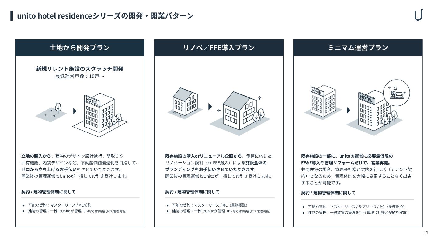 MC契約 • 建物の管理:⼀棟でUnitoが管理(BMなどは再委託にて管理可能) 新規リレント施設のスクラッチ開発 最低運営⼾数:10⼾〜 ⽴地の購⼊から、建物のデザイン設計進⾏、間取りや 共有施設、内装デザインなど、不動産価値最適化を⽬指して、 ゼロから⽴ち上げるお⼿伝いをさせていただきます。 開業後の管理運営もUnitoが⼀括してお引き受けします。 ⼟地から開発プラン 既存施設の購⼊orリニューアル企画から、予算に応じた リノベーション設計(or FFE搬⼊)による施設全体の ブランディングをお⼿伝いさせていただきます。 開業後の管理運営もUnitoが⼀括してお引き受けします。 リノベ∕FFE導⼊プラン 既存施設の⼀部に、unitoの運営に必要最低限の FF&E導⼊や管理リフォームだけで、営業再開。 共同住宅の場合、管理会社様と契約を⾏う形(テナント契 約)となるため、管理体制を⼤幅に変更することなく出店 することが可能です。 ミニマム運営プラン 契約 / 建物管理体制に関して • 可能な契約:マスターリース / MC契約 • 建物の管理:⼀棟でUnitoが管理(BMなどは再委託にて管理可能) 契約 / 建物管理体制に関して • 可能な契約:マスターリース / MC(業務委託) • 建物の管理:⼀棟でUnitoが管理(BMなどは再委託にて管理可能) 契約 / 建物管理体制に関して • 可能な契約:マスターリース / サブリース / MC(業務委託) • 建物の管理:⼀般賃貸の管理を⾏う管理会社様と契約を実施