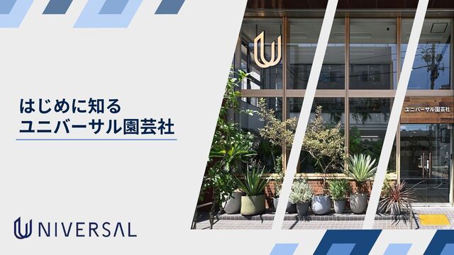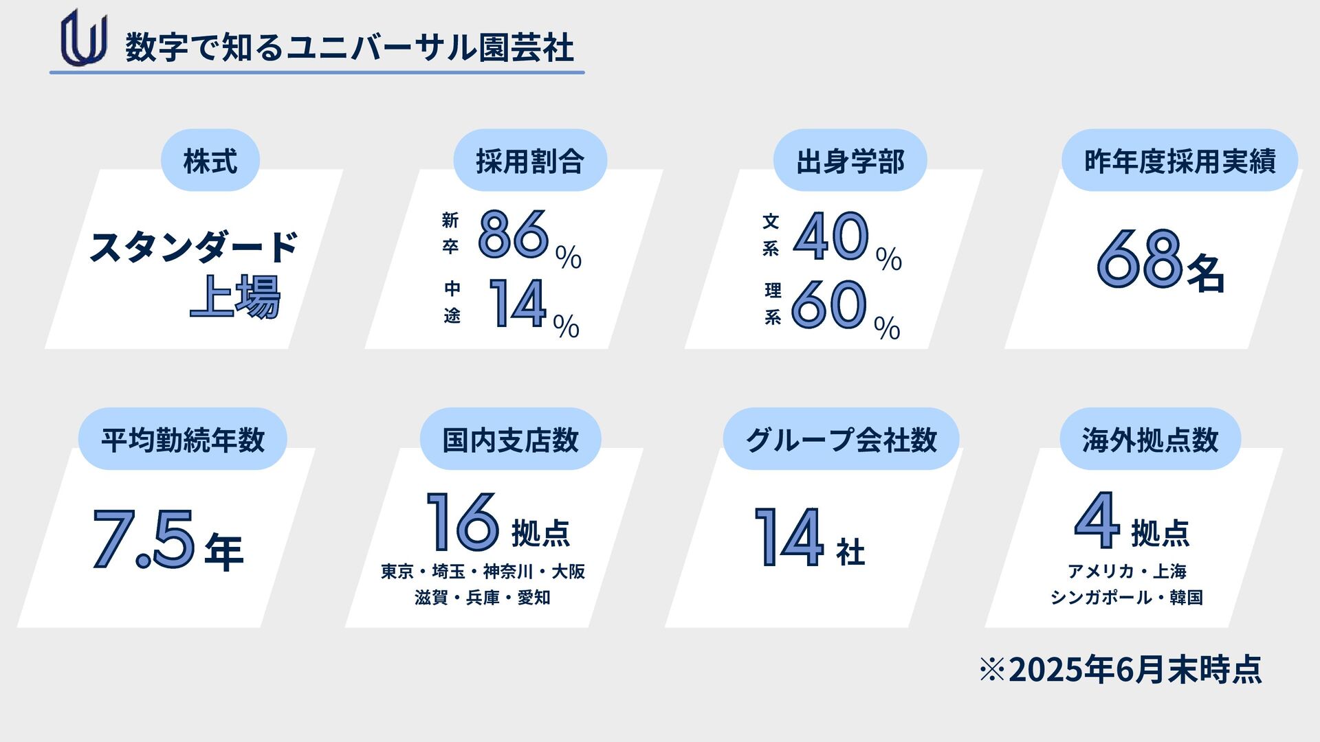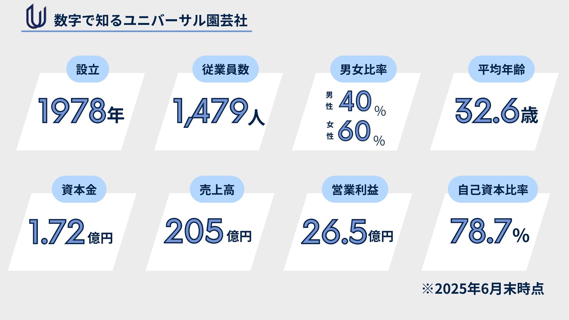 男 性 女 性 1,479 1,479 人 従業員数 32.6 32.6歳 平均年齢 1.72 1.72億円 資本金 205 205 億円 売上高 78.7 78.7% 自己資本比率 営業利益 26.5 26.5 億円 ※2025年6月末時点 数字で知るユニバーサル園芸社