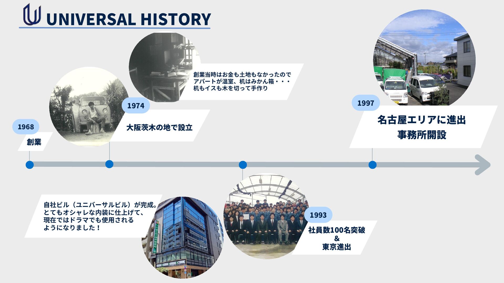 とてもオシャレな内装に仕上げて、 現在ではドラマでも使用される ようになりました! 1968 創業 1997 名古屋エリアに進出 事務所開設 UNIVERSAL HISTORY