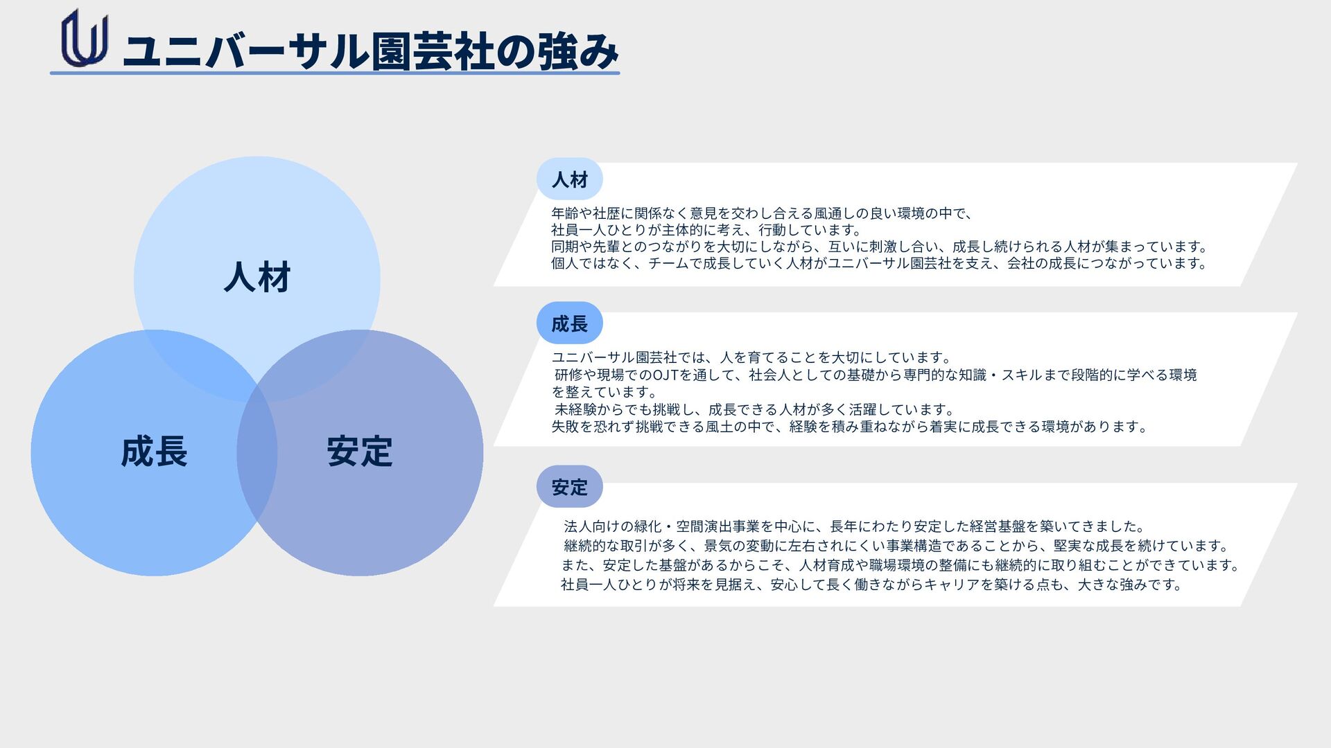 人材 ユニバーサル園芸社の強み 年齢や社歴に関係なく意見を交わし合える風通しの良い環境の中で、 社員一人ひとりが主体的に考え、行動しています。 同期や先輩とのつながりを大切にしながら、互いに刺激し合い、成長し続けられる人材が集まっています。 個人ではなく、チームで成長していく人材がユニバーサル園芸社を支え、会社の成長につながっています。 法人向けの緑化・空間演出事業を中心に、長年にわたり安定した経営基盤を築いてきました。 継続的な取引が多く、景気の変動に左右されにくい事業構造であることから、堅実な成長を続けています。 また、安定した基盤があるからこそ、人材育成や職場環境の整備にも継続的に取り組むことができています。 社員一人ひとりが将来を見据え、安心して長く働きながらキャリアを築ける点も、大きな強みです。