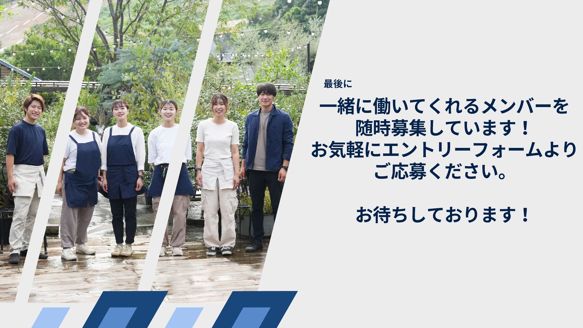 一緒に働いてくれるメンバーを 随時募集しています! お気軽にエントリーフォームより ご応募ください。 お待ちしております! 最後に