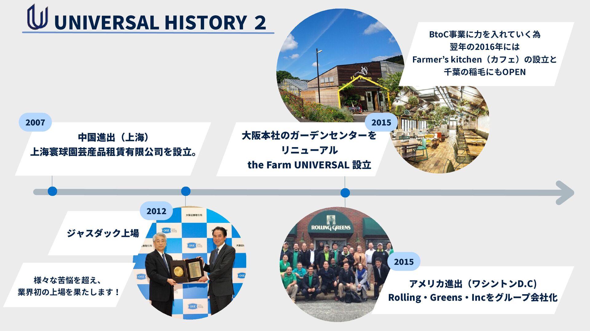 ジャスダック上場 2012 2015 UNIVERSAL HISTORY 2 様々な苦悩を超え、 業界初の上場を果たします! 大阪本社のガーデンセンターを リニューアル